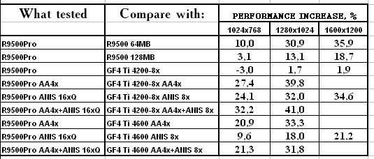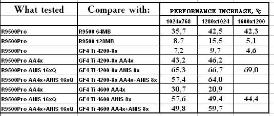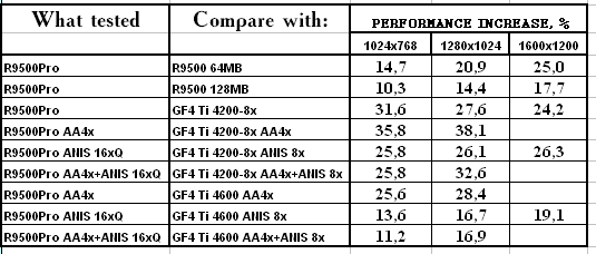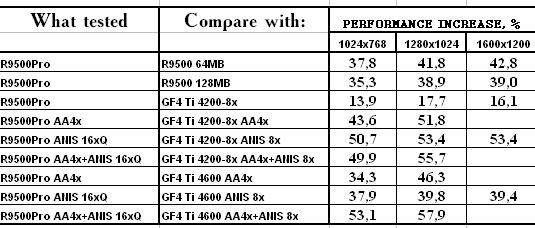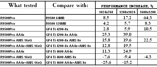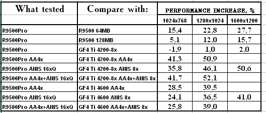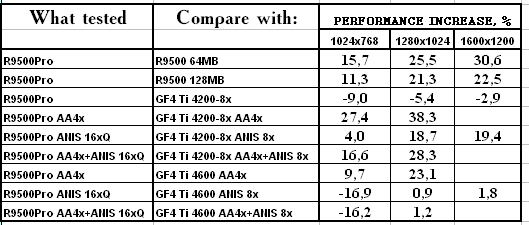 - RADEON 9500 PRO — прекрасный конкурент продуктам на базе GeForce4 Ti 4200-8x, и даже удачный соперник Ti 4600 для любителей тяжелых режимов с АА и/или анизотропией — в наличии сжатие буфера кадров в режимах с MSAA с коэффицентом 2:1 без потерь!