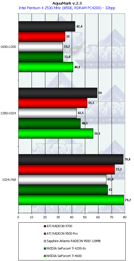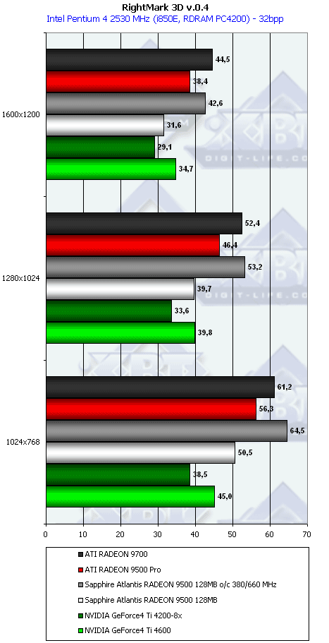 Примечание: В диаграммах по техническим причинам не присутствует RADEON 9500 64MB, но сравнение с ним проводилось, в таблице сравнений эта карта имеется. Хотя, по совести, такому огрызку красная цена не выше $100, за большую сумму он не заслуживает внимания.
