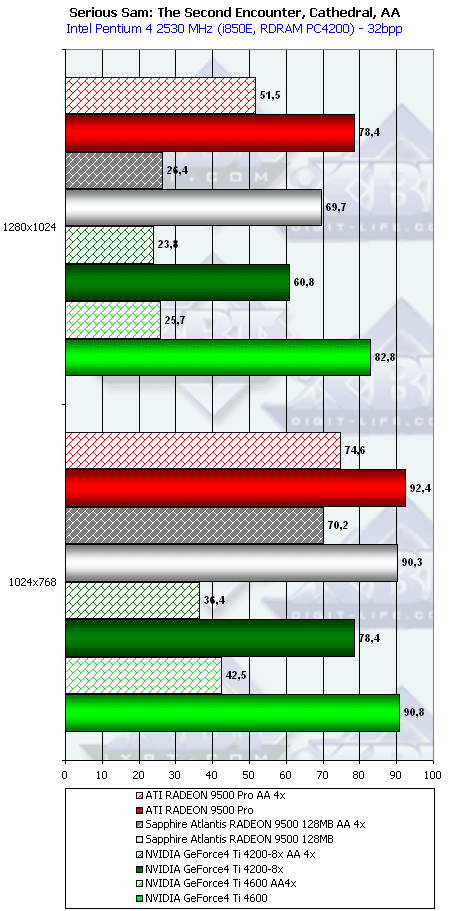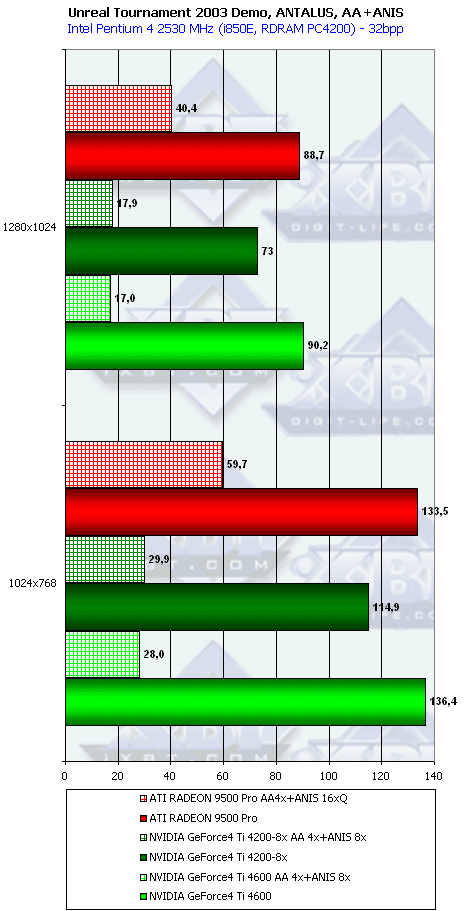Поразительно! У RADEON 9500 PRO (8 конвейеров) скорость при одиночном текстурировании такая же, как и у RADEON 9500 (4 конвейера). Как такое может быть? Дальше мы видим, что при АА2х у RADEON 9500 PRO вообще нет падения производительности, в отличие от GeForce4 Ti 4200-8x. Различие между 9500 и 9500 PRO можно увидеть только в этом режиме АА2х. Заметим также, что при АА4х падение скорости уже началось у RADEON 9500 PRO, однако разница все же очень мала относительно того, что мы видим у Ti 4200-8x.
