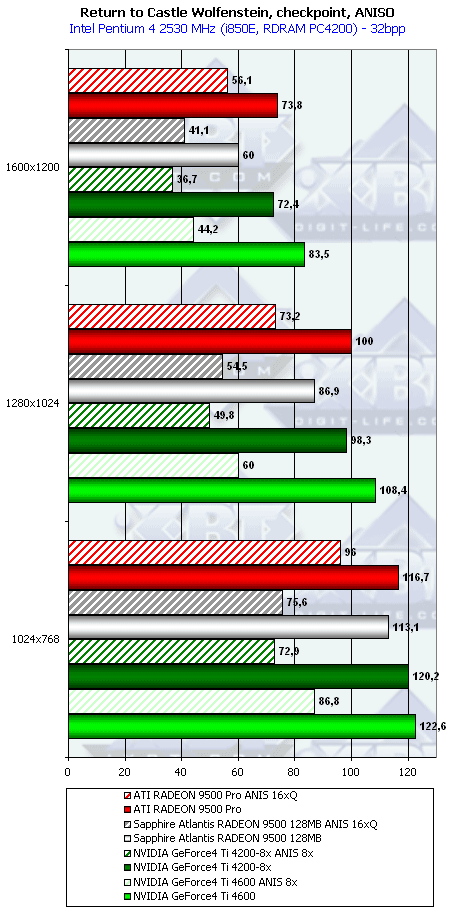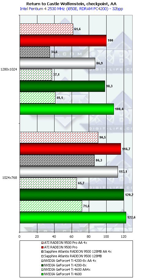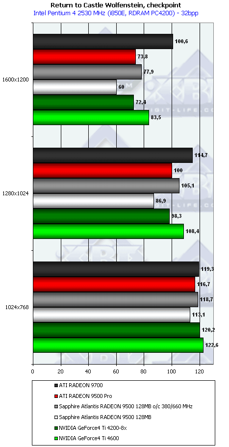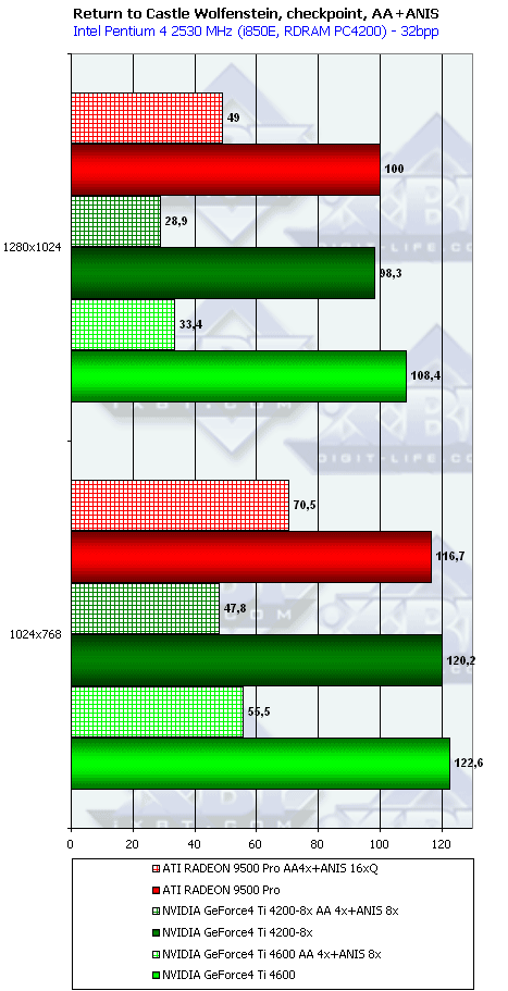 - Return to Castle Wolfenstein (MultiPlayer) (id Software/Activision) — OpenGL, мультитекстурирование, Checkpoint-demo, настройки тестирования — все на максимально возможном уровне, S3TC OFF, конфигурации можно скачать тут
