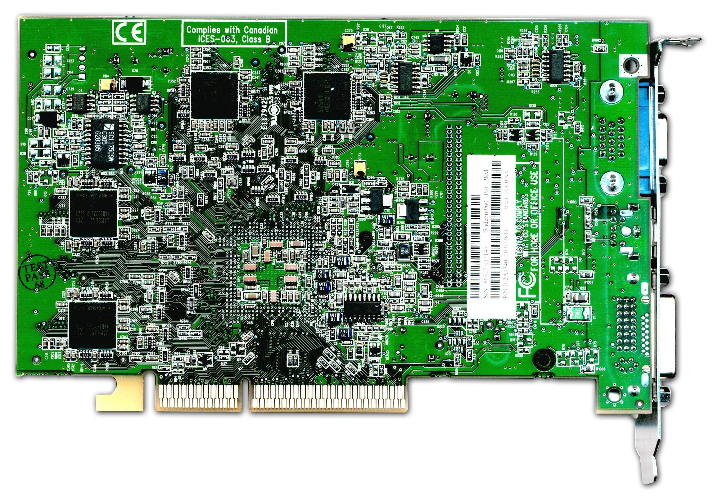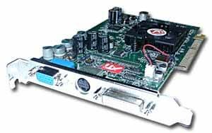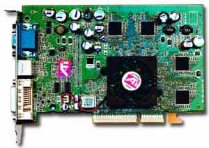 | Карта снабжена интерфейсом AGP х2/x4/x8, 128 МБ локальной памяти DDR SDRAM (восемь микросхем, размещенных на лицевой и оборотной сторонах PCB). | ![]() |