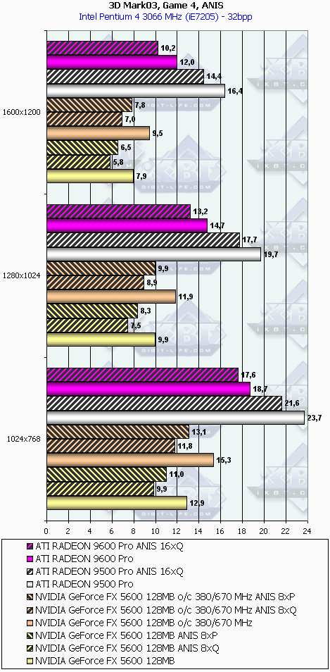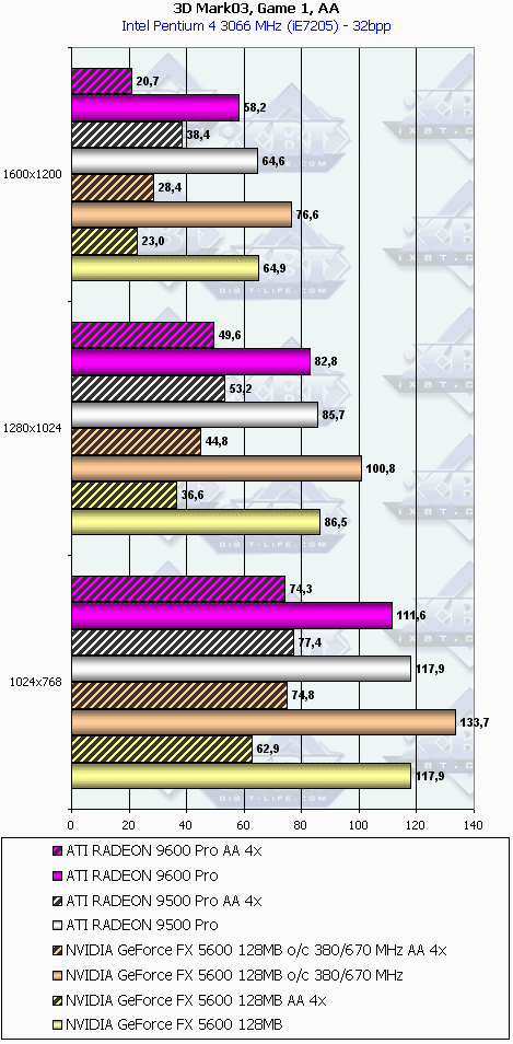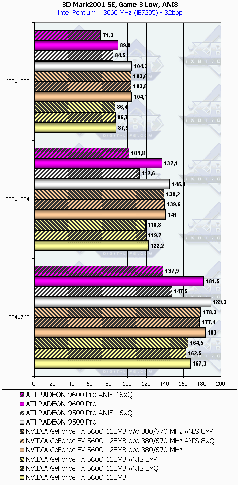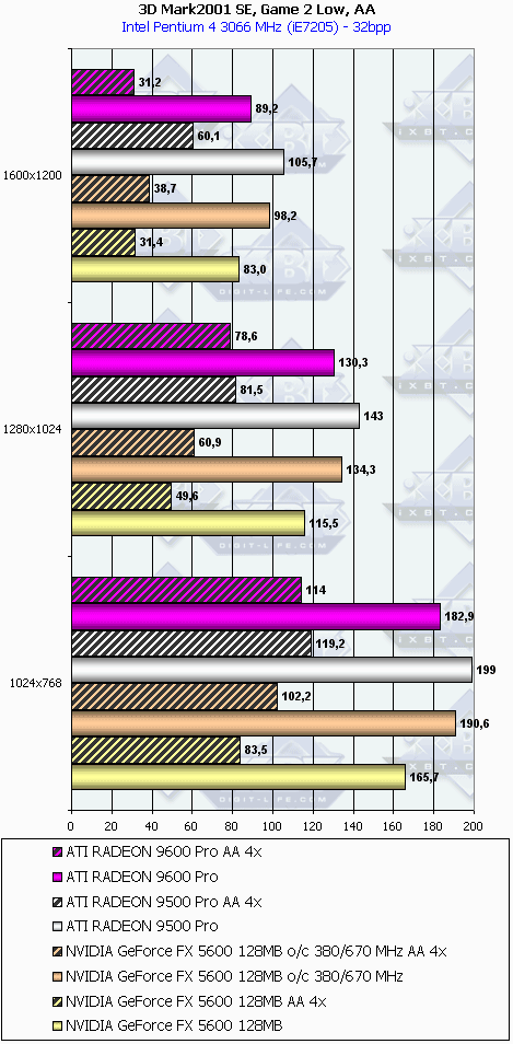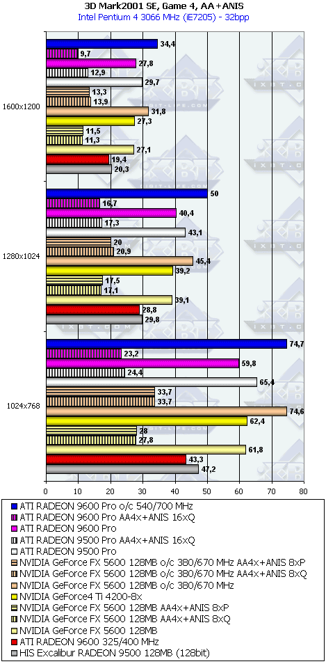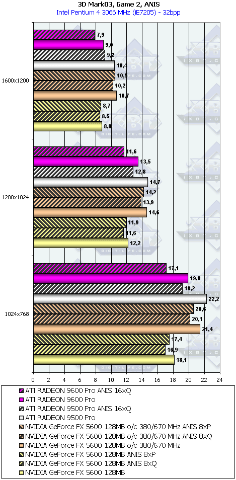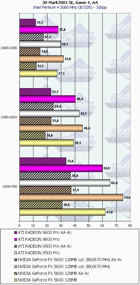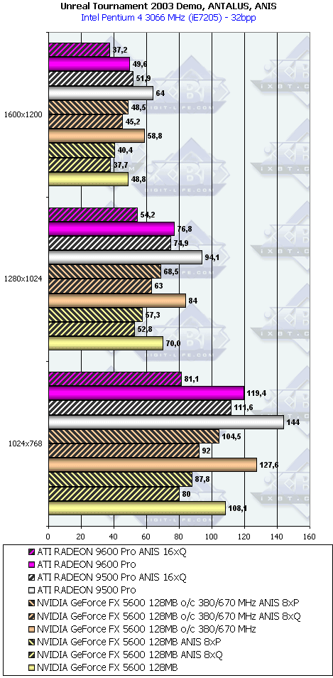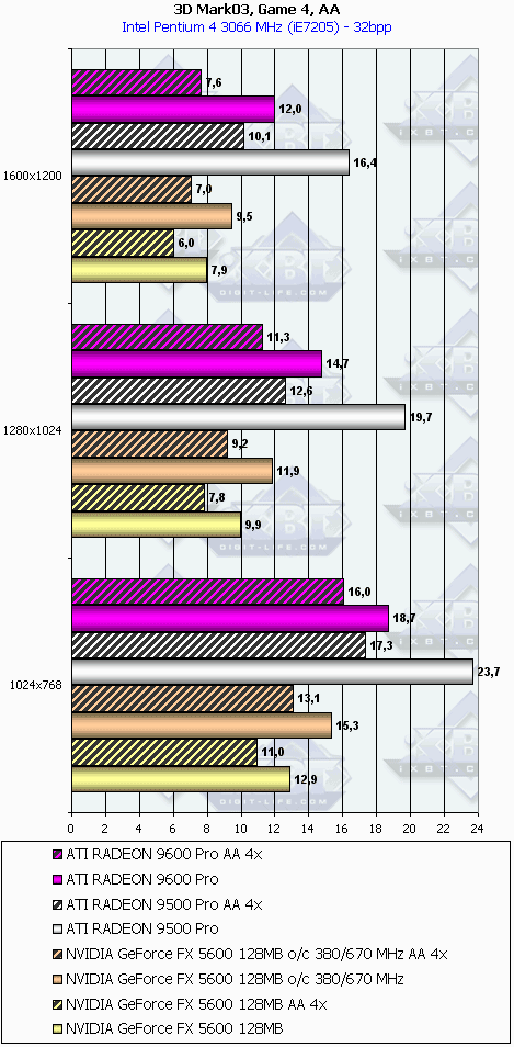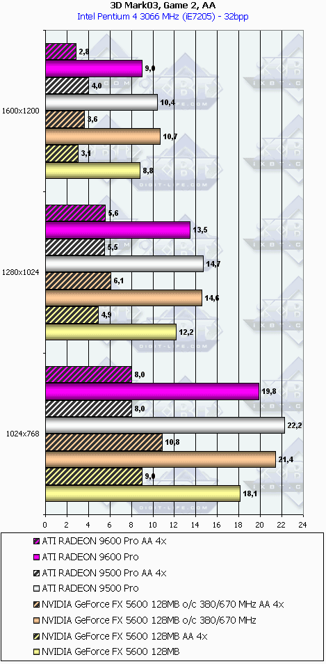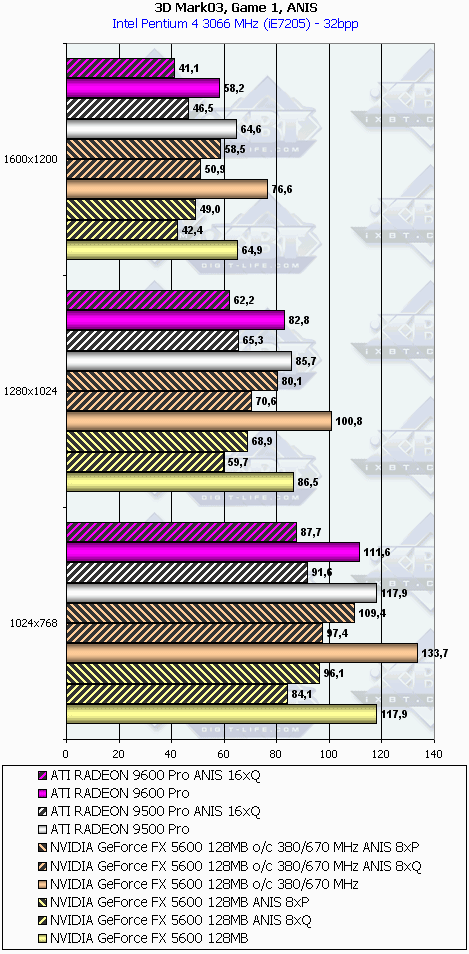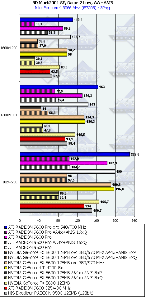А вот тут картина полностью другая. Превосходство RADEON 9600 PRO весьма велико, особенно в режимах с АА. К сожалению, анизотропия все "скушала", и в самых тяжелых режимах детище ATI проигрывает сопернику.
