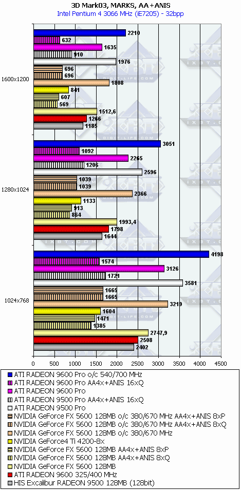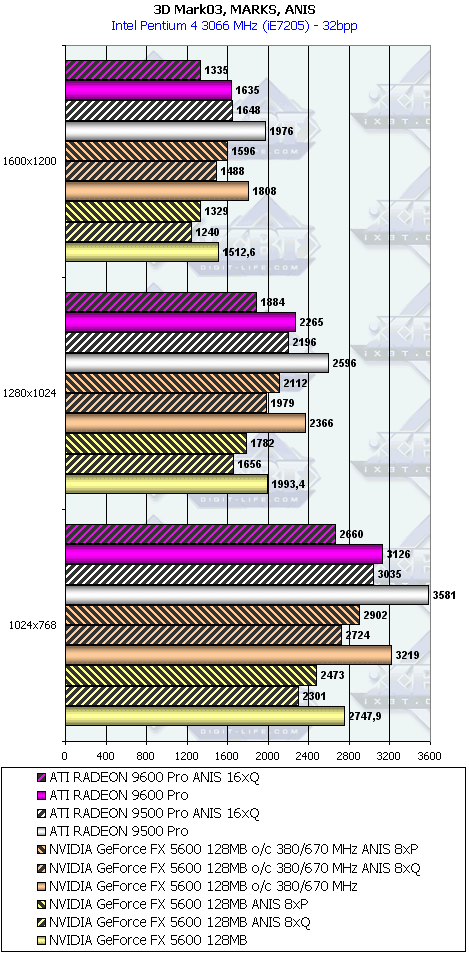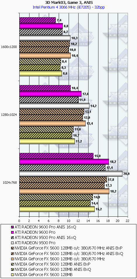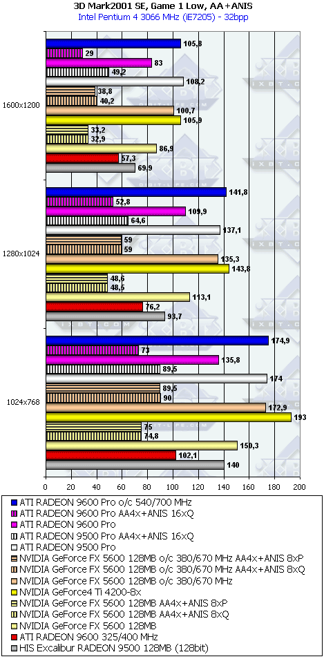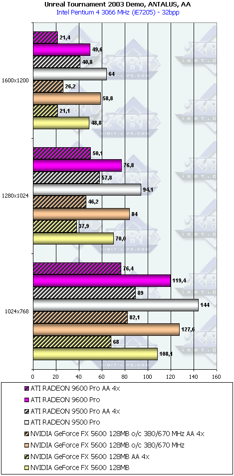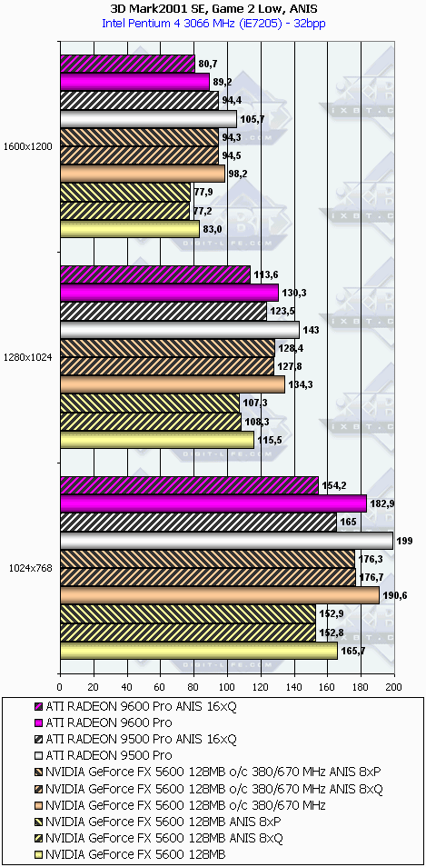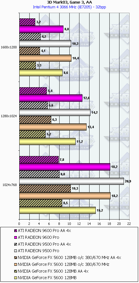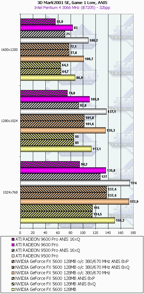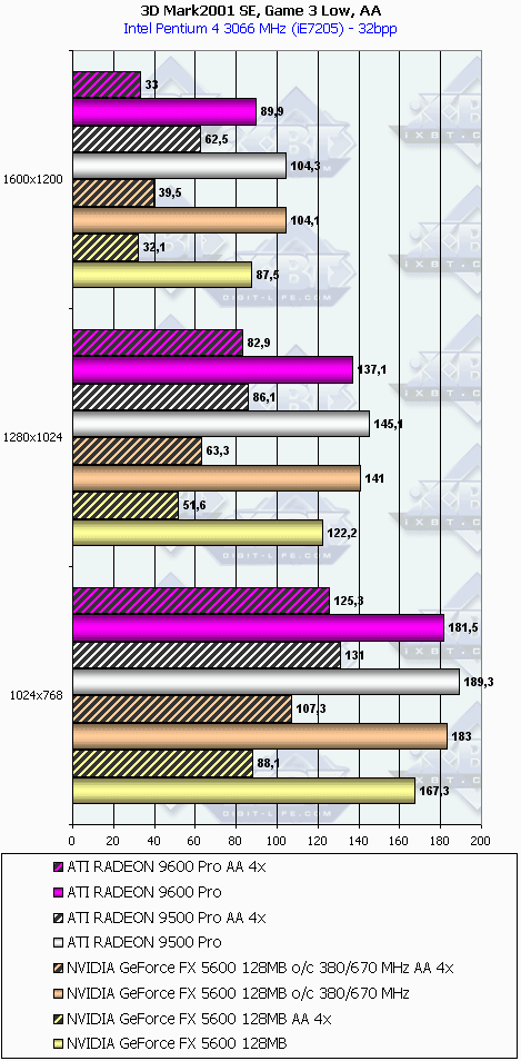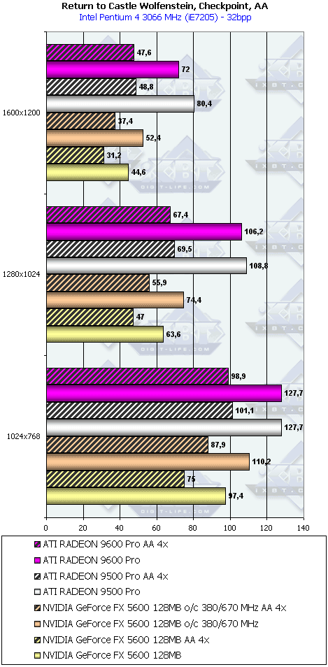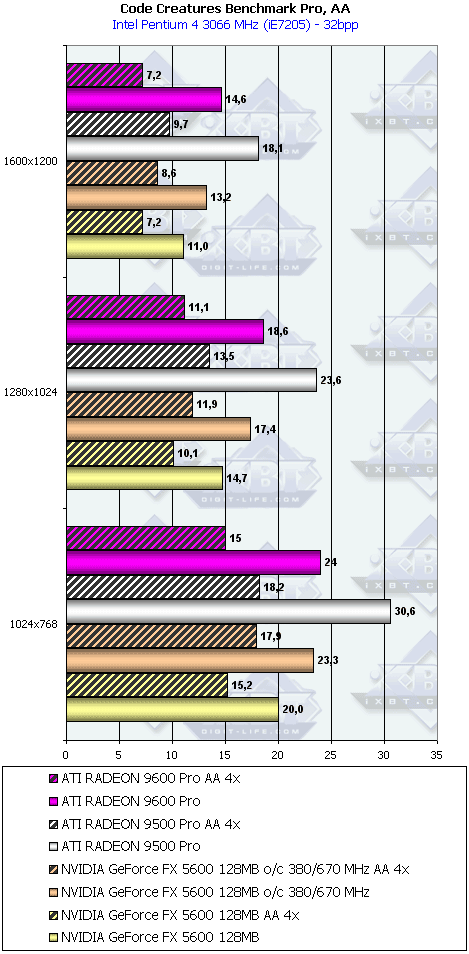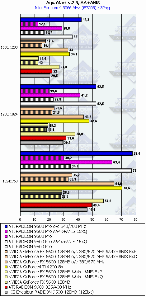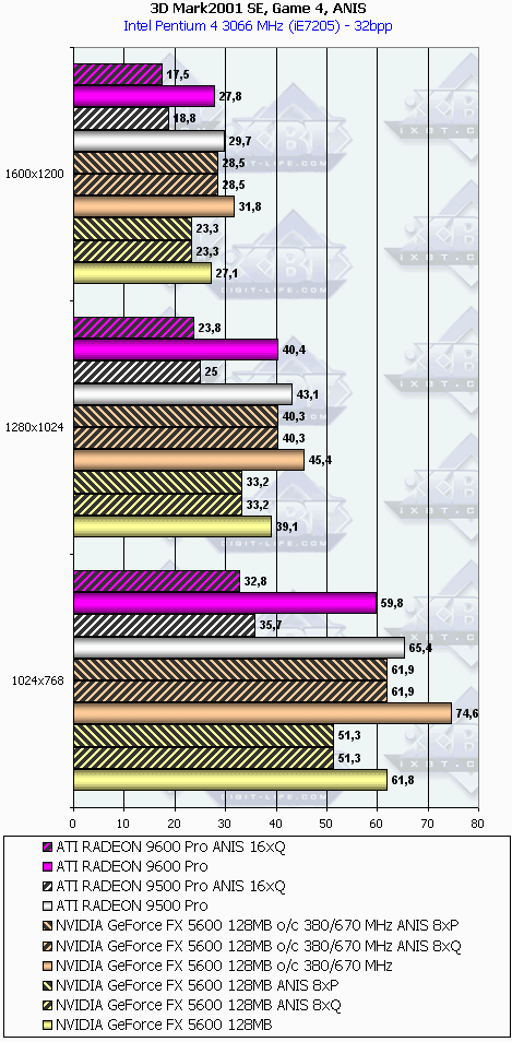 А вот тут картина полностью другая. Превосходство RADEON 9600 PRO весьма велико, особенно в режимах с АА. К сожалению, анизотропия все "скушала", и в самых тяжелых режимах детище ATI проигрывает сопернику.