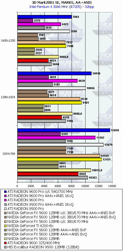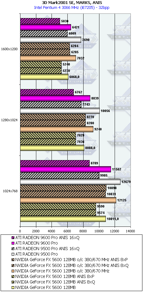 Подводя итоги тестирования в 3DMark2001SE, мы свидетельствуем, что несмотря на столь высокие частоты, RADEON 9600 PRO в большинстве тестов проиграл.