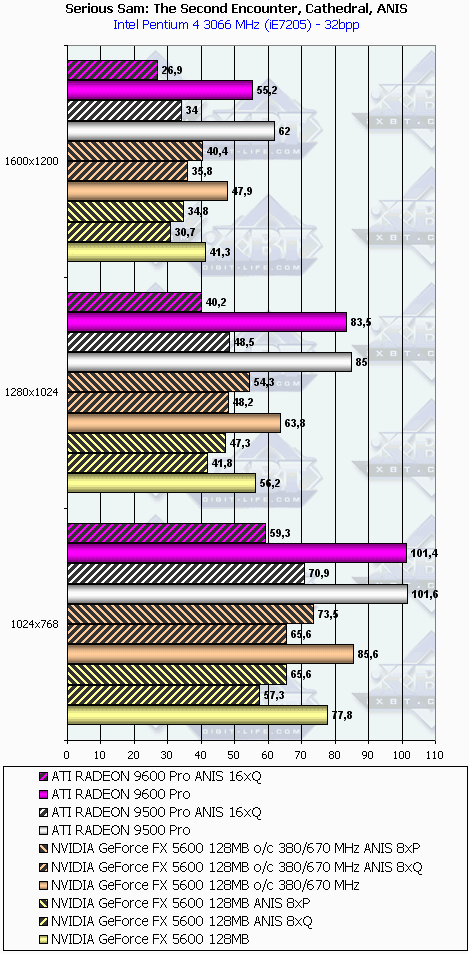 Ситуация еще более радостная для RADEON 9600 PRO. Правда, все равно анизотропная фильтрация все преимущества почти свела на нет.
