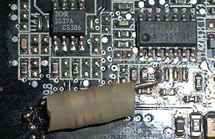 Операцию замера и подбора параметров необходимо производить с особой аккуратностью, т.к. данные цепи очень чувствительны к наводкам любого вида и малейшее неаккуратное прикосновение к оголенным проводам приведет к зависанию видеокарты, и вам лишний раз придется выключать компьютер (именно выключать, потому что простая перезагрузка не помогает). Поднятие напряжения нужно обязательно контролировать мультиметром, поднимать следует мелкими порциями уменьшая сопротивление переменного резистора и, если вы не припаивали дополнительное сопротивление последовательно с переменным, каждый раз контролируя сопротивление переменного резистора. Максимальное значение, до которого следует поднимать напряжение на большинстве микросхем памяти, составляет 3.2- 3.3V. Можно и больше, но это на ваш страх и риск. При более высоком поднятии напряжения, пассивного охлаждения видеопамяти может и не хватить. Для нашей видеокарты конечное выходное напряжение внутренних каскадов питания микросхем памяти составило 3.28V — разумный, в нашем случае, компромисс между опасностью выхода памяти из строя и возможностями разгона. После установки напряжения необходимо произвести ряд тестов с поднятыми частотами памяти, после чего, если все прошло нормально, следует отпаять, измерить установленное сопротивление и подобрать в качестве замены аналогичный номинал МЛТ резисторов (при невозможности точно подобрать номинал путем использования одного резистора, можно воспользоваться параллельным или последовательным соединением 2-х или более резисторов). Конструкцию резисторов желательно поместить в защитный кембрик. Вот как выглядит соответствующая область видеокарты после проведения работ: