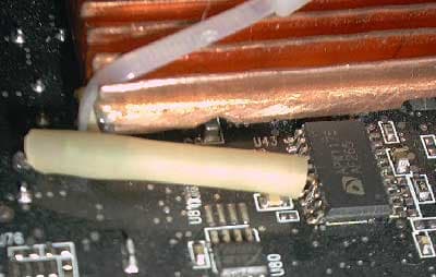 С напряжением в 1,65V, что больше номинального на 10%, удалось достичь очень хороших результатов, но об этом подробно будет рассказано ниже… А вот так выглядит область платы видеоадаптера после вольтмода графического процессора: