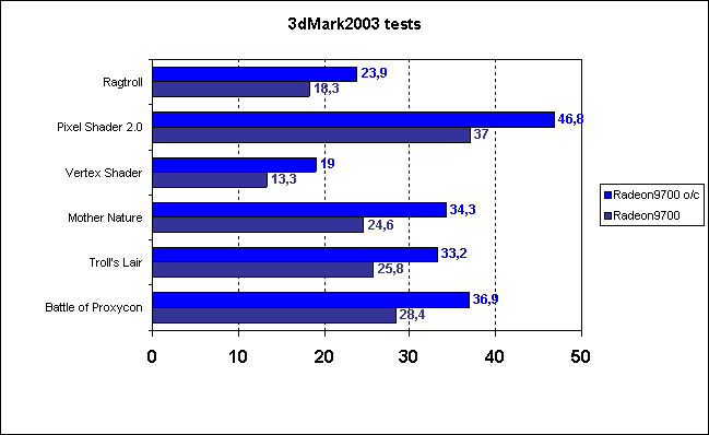- 3DMark 2003 v.340, как тест, напрямую зависящий от скорости видеокарты, на котором отчетливо видны любые изменения частот.