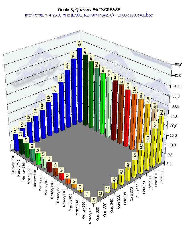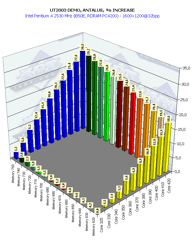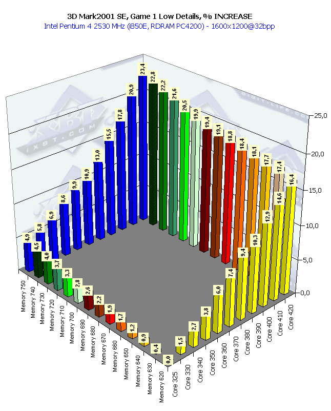 Интересный момент: четко сбалансированная работа чипа и памяти. Приросты частот памяти и процессора практически одинаково влияют на повышение производительности. И посмотрите на колоссальный прирост скорости в 61% (частота чипа выросла на 29%, частота памяти — 21%).