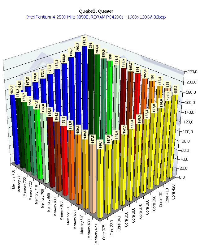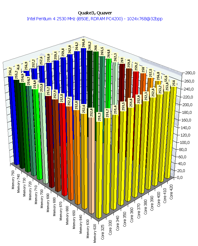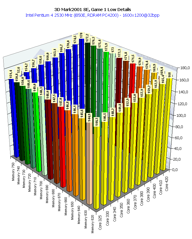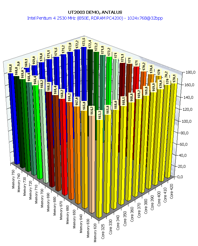 Вот мы и увидели, как вступила в действие видеокарта, вернее, графический процессор, показав свой прекрасный потенциал, который от частоты памяти практически не зависит. Любопытно отметить, что UT2003 оперирует с вершинными шейдерами, практически вся геометрическая часть базируется на этой технике, а у RADEON 9700 Pro скорость работы с шейдерами на высоте.