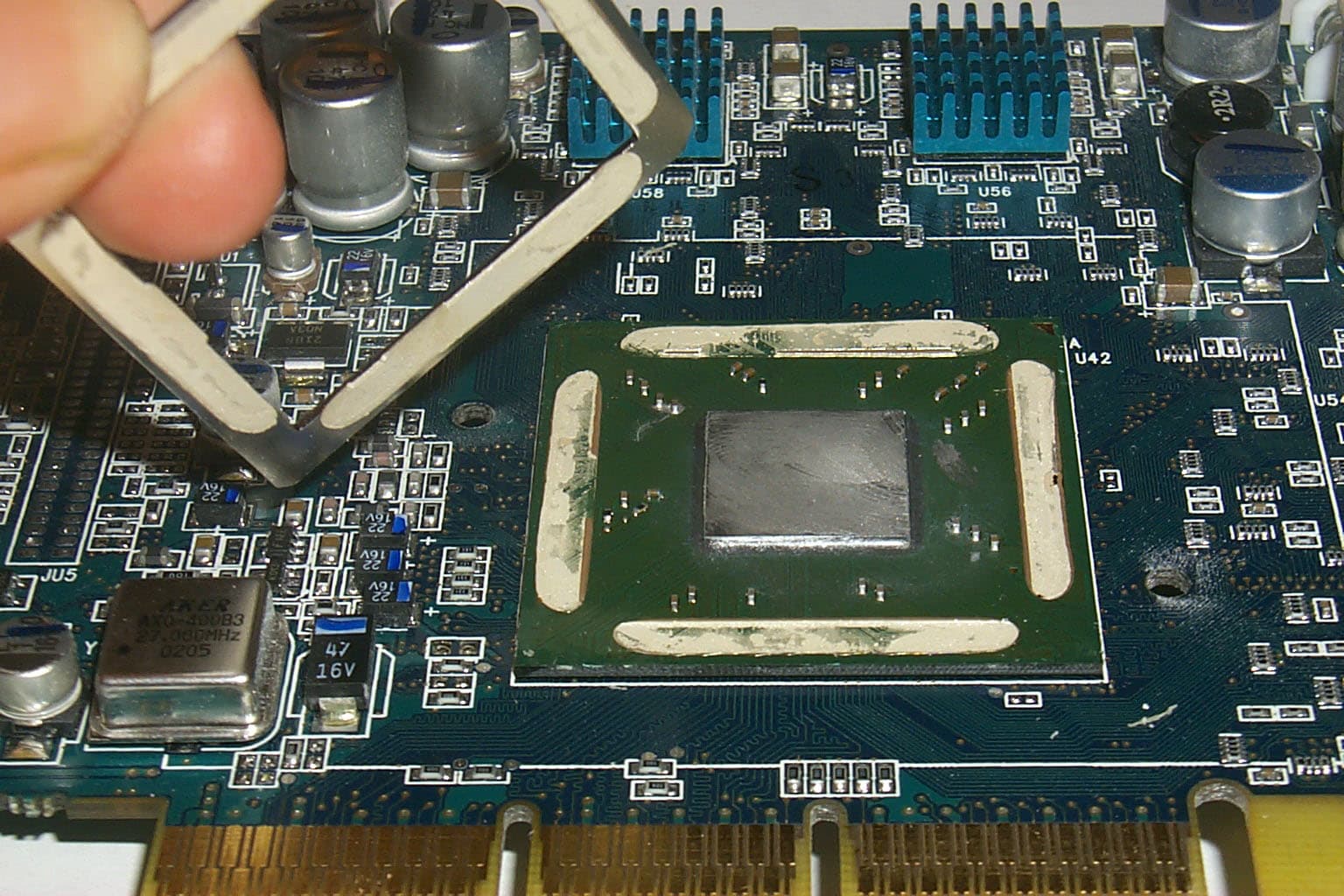 Еще когда мы рассматривали RADEON 9700 PRO, то заметили, что у многих карт высота кристалла ниже защитной рамки, которая расположена по периметру подошвы чипа. И в одном из материалов проделали эксперимент по снятию этой рамки, чтобы радиатор лучше прижимался к кристаллу:
