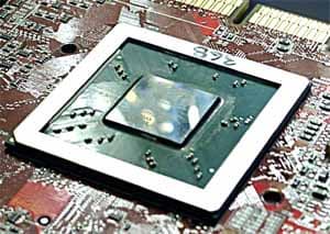 Раз мы сняли кулер, то можно оценить и размер кристалла. Он примерно такого же размера, как и R300, но зато имеет несколько иную подложку, придающую ему зеркальность. Упаковка кристалла такая же — FCPGA.