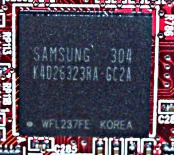 | На карте установлены микросхемы памяти Samsung марки K4D26323RA-GC2A, форм-фактора BGA. Максимальная частота работы — 350 (700) МГц, поэтому можно сделать вывод, что время выборки — 2.8 нс. По умолчанию память работает на частоте 340 (680) МГц, чип — 380 МГц. | ![]() |