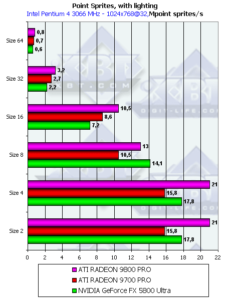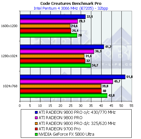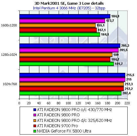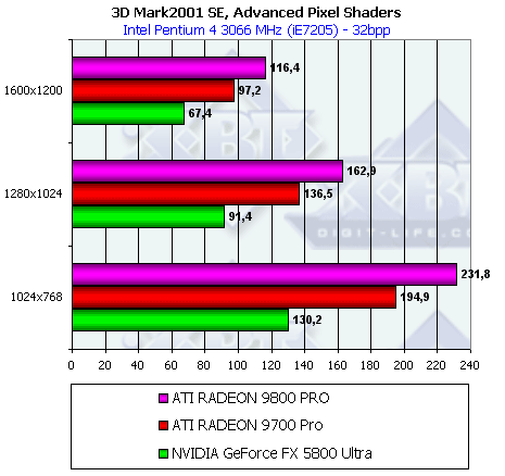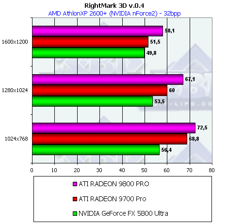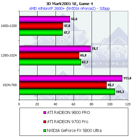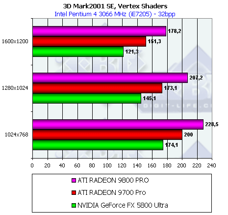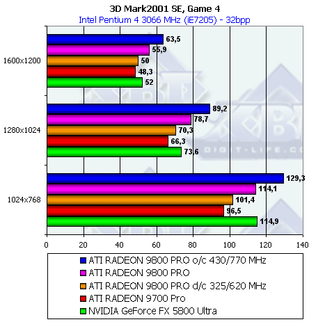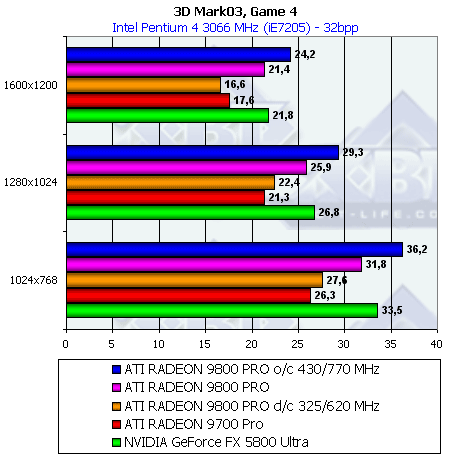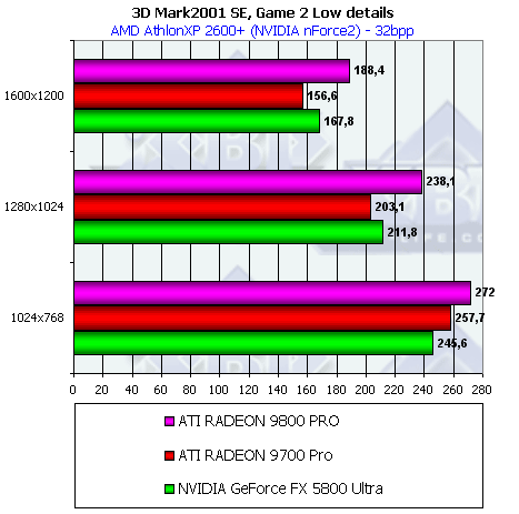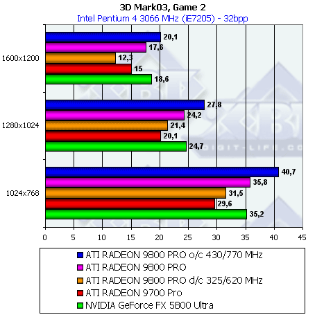 И вот перед нами тест, где огромную роль играет скорость работы шейдеров. Как известно, в этом плане у детищ ATI все в порядке в отличие от NVIDIA GeForce FX 5800. Потому мы и наблюдаем победу RADEON 9800 PRO.