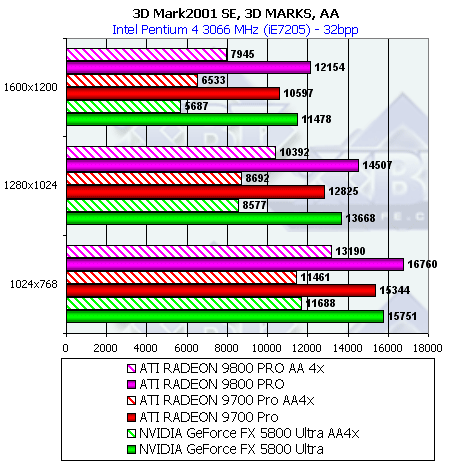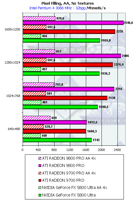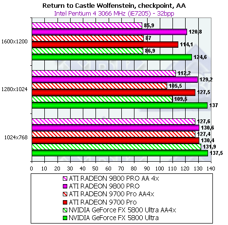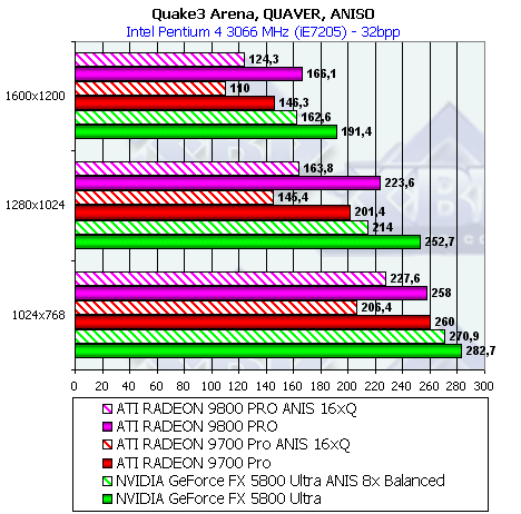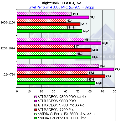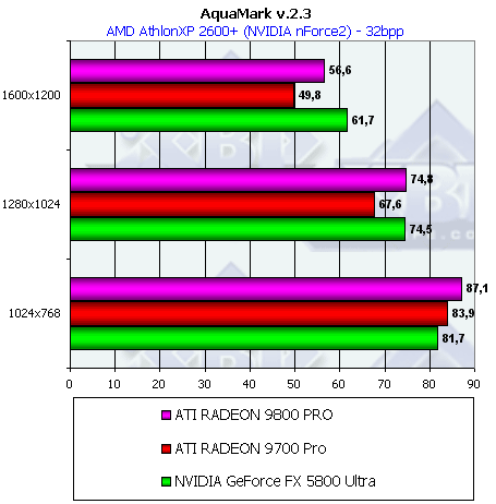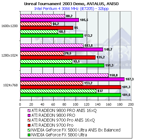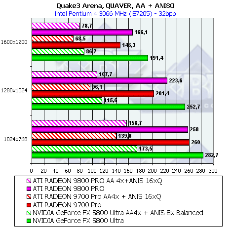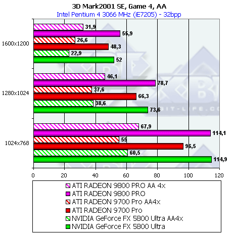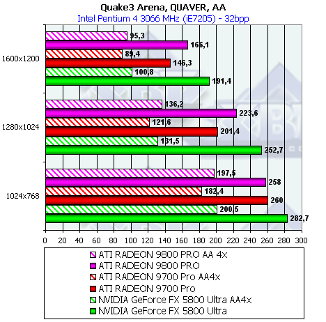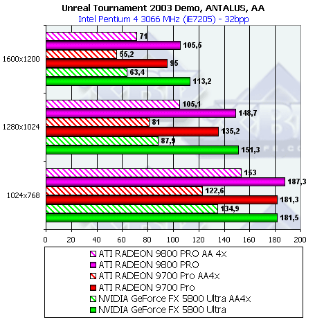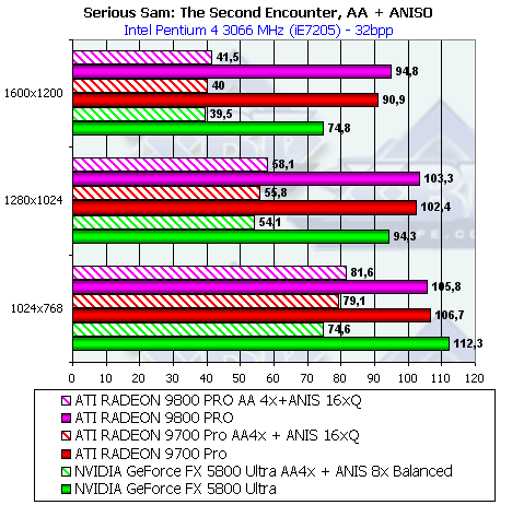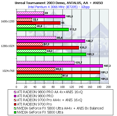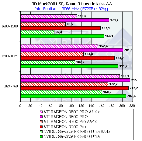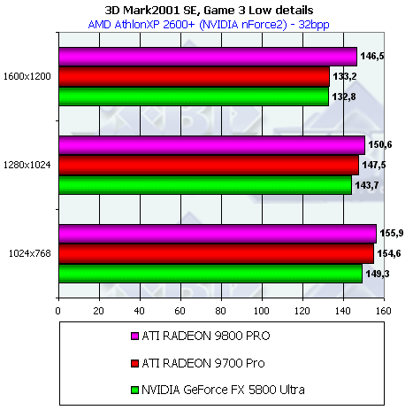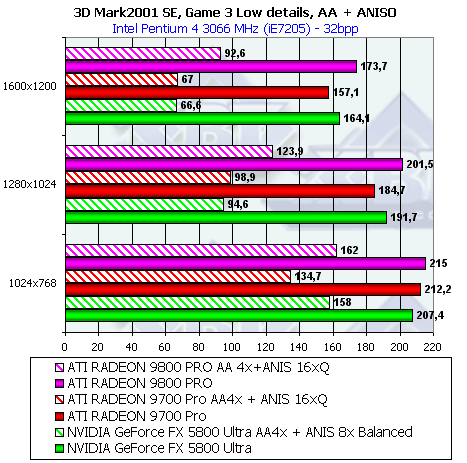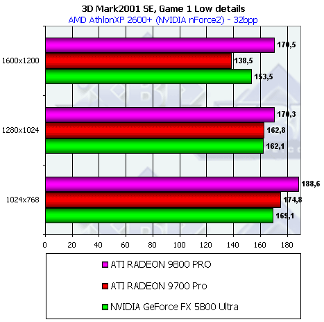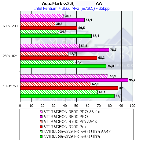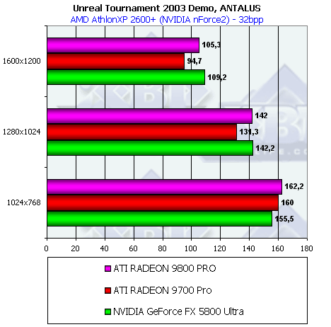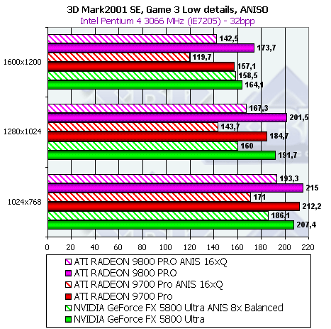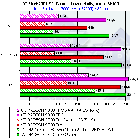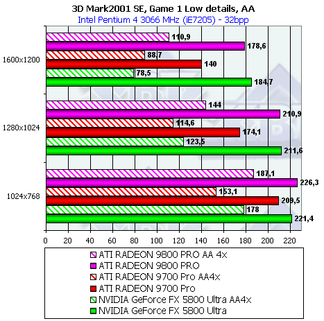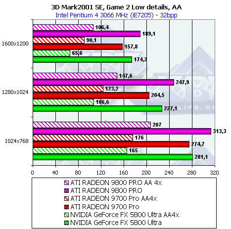Картина разнородная. В режимах без дополнительной нагрузки RADEON 9800 PRO победил (кроме 1600х1200), а вот при нагрузке АА и анизотропией проиграл сопернику, несмотря на то, что в АА выглядел по скорости лучше.