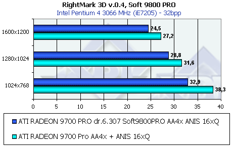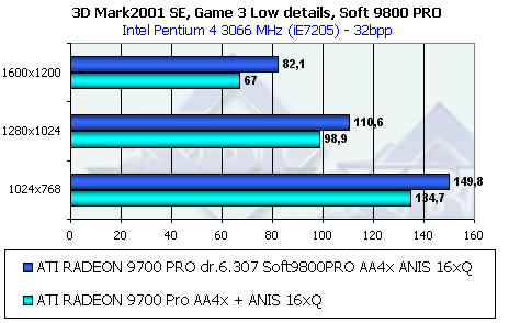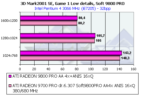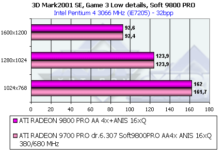 Однако что странно: Soft9800 PRO на частотах "родного" 9800 PRO продемонстрировал более высокую скорость, нежели сам RADEON 9800 PRO (с АА и анизотропией). Как говорится, перестарались :-). А если серьезно, то данный факт говорит о том, что все же RADEON 9800 PRO не является 9700-м, работающим на более высоких частотах, это все же другой процессор.