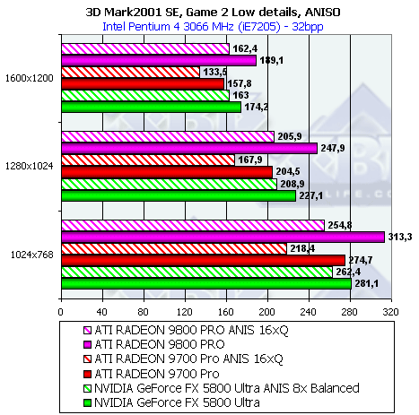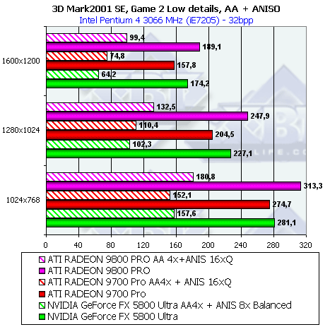 Обратим внимание на то, что форсирование RADEON 9800 при АА и анизотропии на RADEON 9700 PRO привело к существенному росту производительности относительно результатов самого RADEON 9700 PRO при АА и анизотропии. Заточка драйверов? Однозначно! Хотя без нагрузки АА и анизо прироста почти нет.