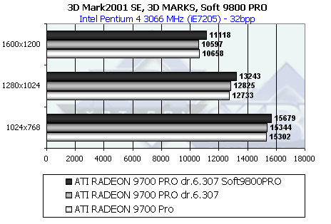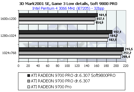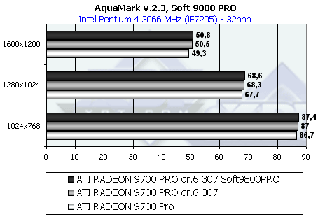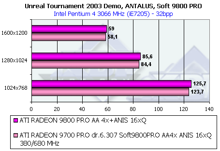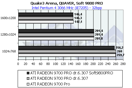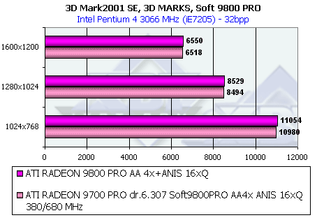 Но при этом мы наблюдаем, что драйверы от ATI просто отлично заточены под RADEON 9800 PRO, что дало Soft9800 PRO получить превосходство почти в 25% над RADEON 9700 PRO на его же частотах.