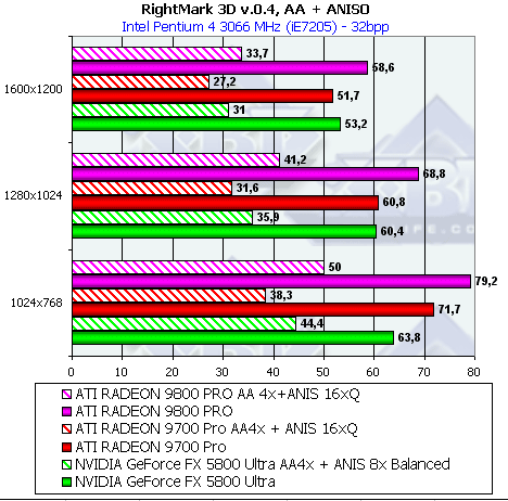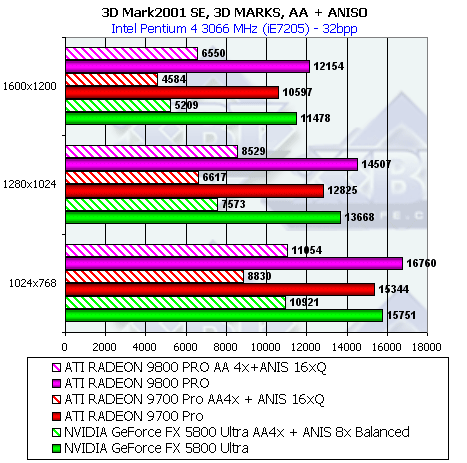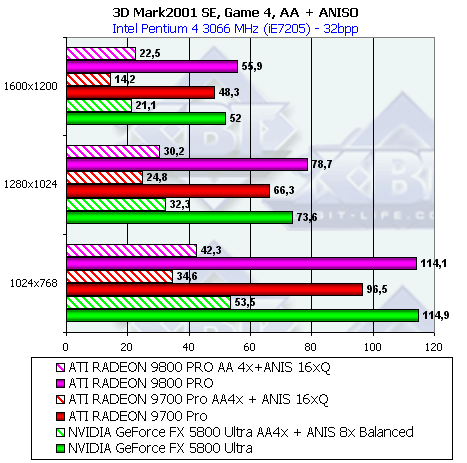 А вот этот тест нам говорит, что его любит больше ATI, чем NVIDIA :-). Несмотря на то, что при анизотропии RADEON 9800 PRO проиграл сопернику, засчет более быстрого АА новый продукт ATI в тяжелом режиме АА+анизотропия все же выиграл.
