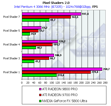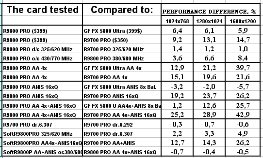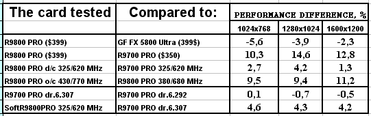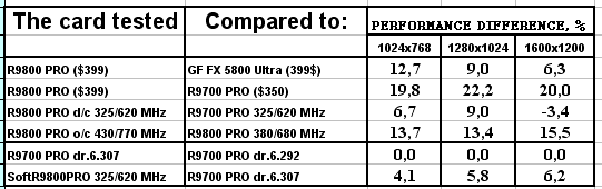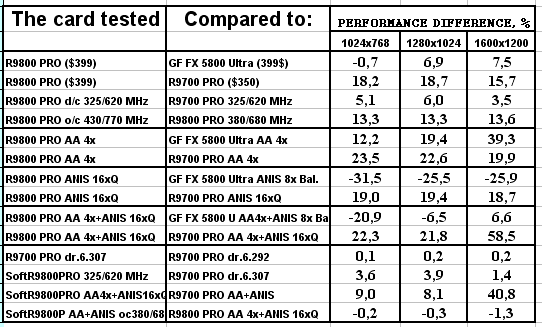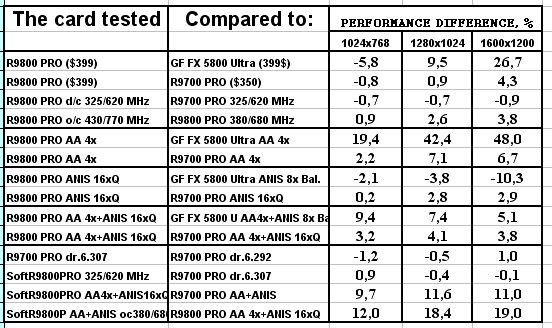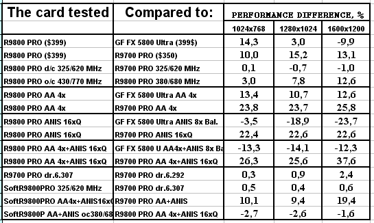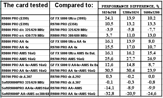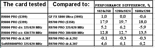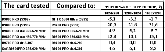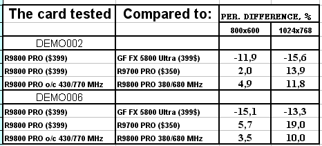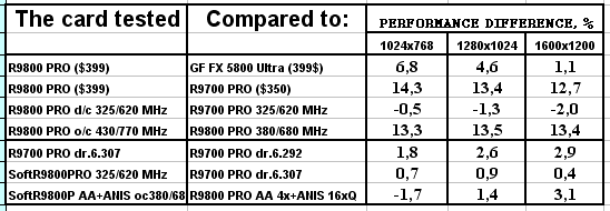 То есть, когда дело доходит до игр или тестов, под которые программисты не смогли сделать какую-либо оптимизацию в драйверах, когда процессор работает чисто своими возможностями, и когда тест активно использует современные технологии, RADEON 9800 PRO показывает явно, что он самостоятельный продукт, а не просто "улучшенная ревизия" 9700 PRO.