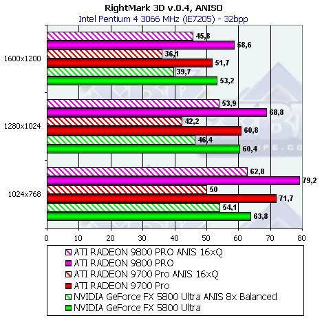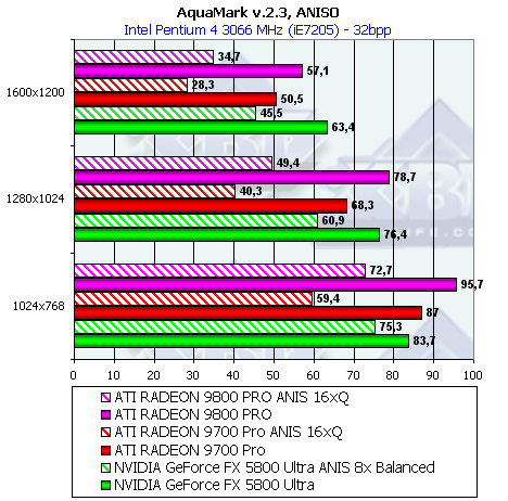 Сразу отмечу, почему мы использовали в наших тестах настройки анизотропии 16х у карт от ATI и 8х у карт от NVIDIA. Никакой дискриминации в отношении карт от ATI нет! Алгоритмы работы этой функции у ATI и NVIDIA очень различаются (об этом мы говорили подробно в нашем материале по NV30), поэтому сопоставлять только цифры "8" неразумно. Критерий один: максимально возможное качество. У NVIDIA по ее "счетчику" — это 8х, а у ATI — 16х. Скриншоты мы уже приводили, и не один раз. К тому же, интересно будет узнать, как сопоставляются разные режимы работы анизотропии (Application, Balanced, Aggressive) от NVIDIA с максимально качественным режимом от ATI, тем более, что опять же, скриншоты мы уже приводили, и читатель может оценить соотношение скорости и качества (милости просим в обзор NV30 за скриншотами оценки качества анизотропной фильтрации).