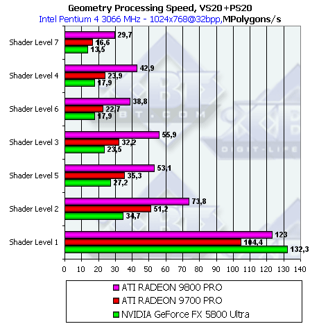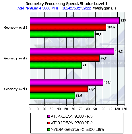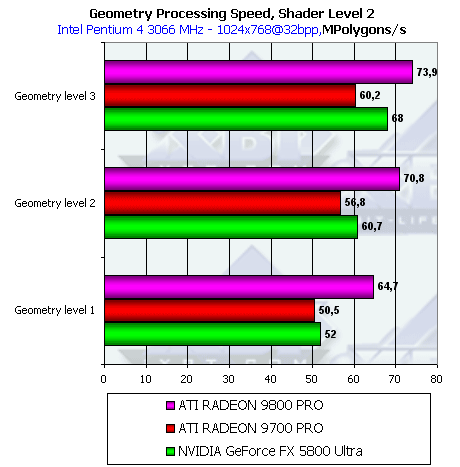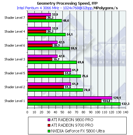 И… Как только попадается тест, который не является массово используемым, мы не обнаруживаем в нем заточки драйверов под RADEON 9800 PRO. Именно в этом тесте последний берет только своими более высокими частотами и теми оптимизациями (кеши, более высокие скорости работы шейдеров и др.), которые, безусловно, имеются в самом процессоре.