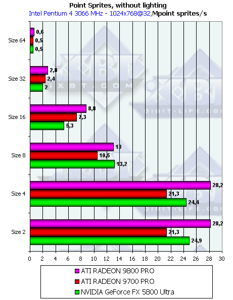Вот где все и раскрывается :-). С одной стороны, видна убедительная и даже великолепная победа RADEON 9800 PRO над соперником от NVIDIA, поскольку снова и снова мы говорим о скорости работы шейдеров, которая выше у продуктов от ATI; с другом стороны, данный тест является внутренним, он недоступен программистам от ATI или NVIDIA, поэтому мы видим потрясающую картину: Soft 9800 PRO 380/680 MHz в тяжелых режимах катастрофически отстал от "родного" RADEON 9800 PRO! Более того, на частотах 325/620 МГц он отстал и от RADEON 9700 PRO!