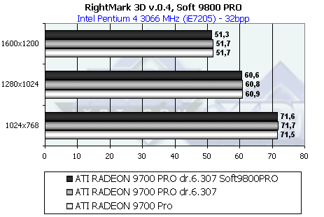 Наблюдаем такую же картину оптимизации драйверов от ATI под RADEON 9800 PRO, когда "обведение драйверов вокруг пальца" с подставлением для 9700 PRO Device ID от 9800 PRO приводит к росту производительности.