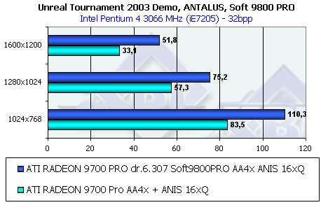 Насчет оптимизации драйверов под 9800, мы видим, что на частотах 9700 PRO она есть, да и очень даже приличная. Разогнанный до частот 9800 PRO ускоритель на базе 9700 PRO, переделанный в Soft9800 PRO показал точно такую же производительность в режимах с АА и анизотропией, что и "родной" RADEON 9800 PRO, поэтому можно вести смело речь о чистой оптимизации.