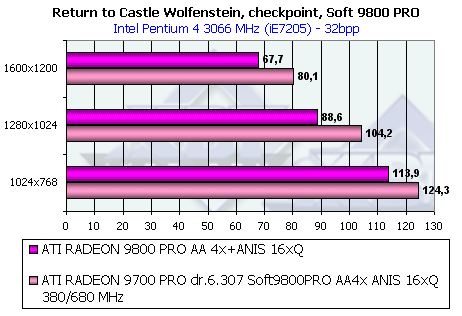 Есть ли заточка драйверов под RADEON 9800 PRO и в этой игре? Разумеется, есть! И это видно на диаграммах. Однако, мы можем это видеть только в режимах с АА и анизотропией. Плюс мы снова видим, что скорость Soft 9800 PRO на частотах 380/680 МГц выше, чем у RADEON 9800 PRO, что дает еще раз повод для размышлений, поскольку теория, выдвинутая рядом СМИ в Сети о том, что RADEON 9800 PRO = RADEON 9700 PRO + повышенные частоты, терпит крах.