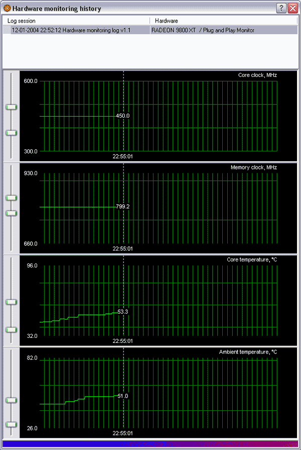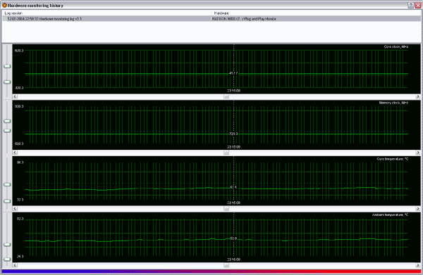 Заметим, что при работе на штатных частотах (без какого-либо дополнительного охлаждения) температура изменяется очень мало, находясь в пределах 50-52 градусов. Мы помним, что при активной функции OverDrive повышение частот до 432 МГц идет только в случае температуры чипа не выше 35 градусов. И в остальных — только до 418 МГц (а при температуре свыше 55 градусов идет снижение до номинала). Судя по вышеприведенному графику изменения температур, OverDrive тут фикция, потому что даже при легкой нагрузке температура уже выше 50 градусов.