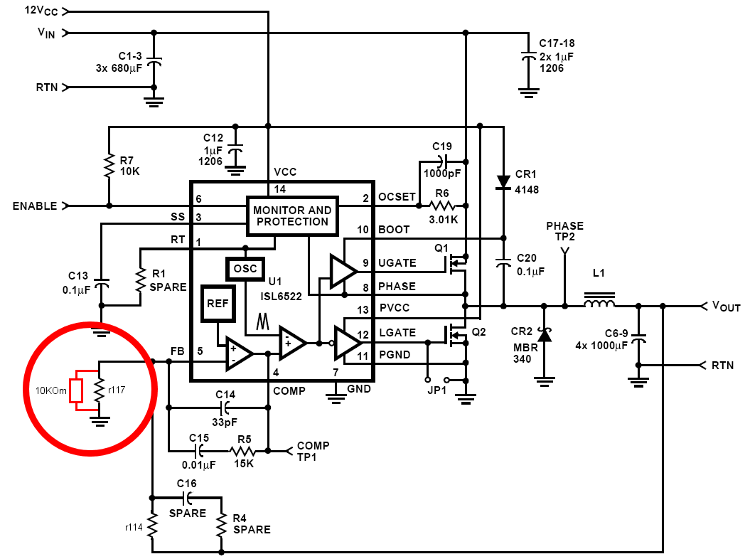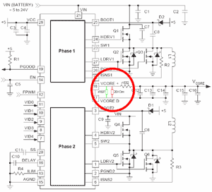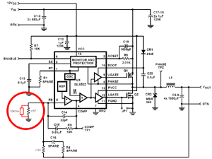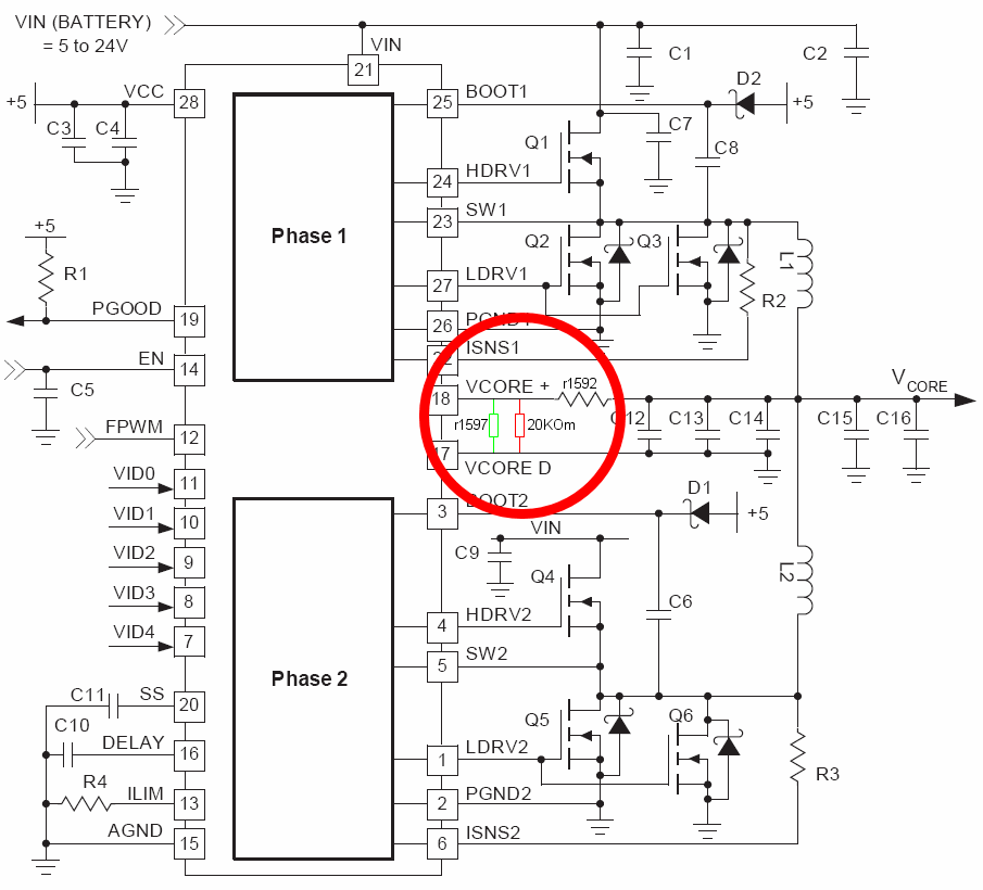 Тем не менее, несмотря на рекомендуемую производителем контроллера разводку, кроме резистора (r1592) между 18 выводом и результирующим выводом напряжения, имеется резистор (r1597) между 17 (VCoreD) и 18 (VCore+) выводами (Рис. 3).