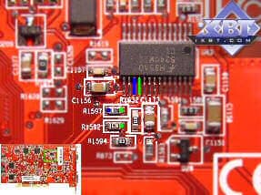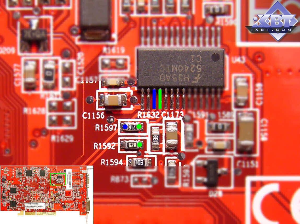 VGPU=1.40*(1+r1592/r1597). Номиналы сопротивлений r1592 и r1597 равны 432 и 1620 Ом соответственно. Подставив эти значения в указанную формулу, получается, что подводимое к графическому процессору напряжение равно 1,77VDC, что подтверждается непосредственным измерением. Очевидно, что для поднятия напряжения на ядре, необходимо уменьшить номинал сопротивления r1597.