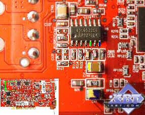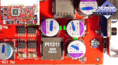Самый простой способ — припаять подстроечный резистор на 20КОм параллельно r1597. Надо отметить, что из-за малых размеров этого резистора возрастает вероятность того, что он просто отпаяется. Поэтому лучше всего один из контактов резистора припаять к r1597 в точке, отмеченной синим, а второй контакт — к r1592 в точке, отмеченной зеленым. Естественно, припаиваемые контакты подстроечного резистора должны обеспечивать максимальное сопротивление между собой. В итоге должно получится напряжение около 1.80VDC. Наиболее удобная контрольная точка измерения напряжения на ядре указана на рисунке.