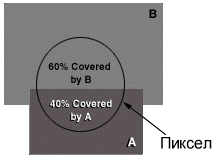 Например как показано на рисунке ниже, пиксел перекрывают два полигона: A и B.