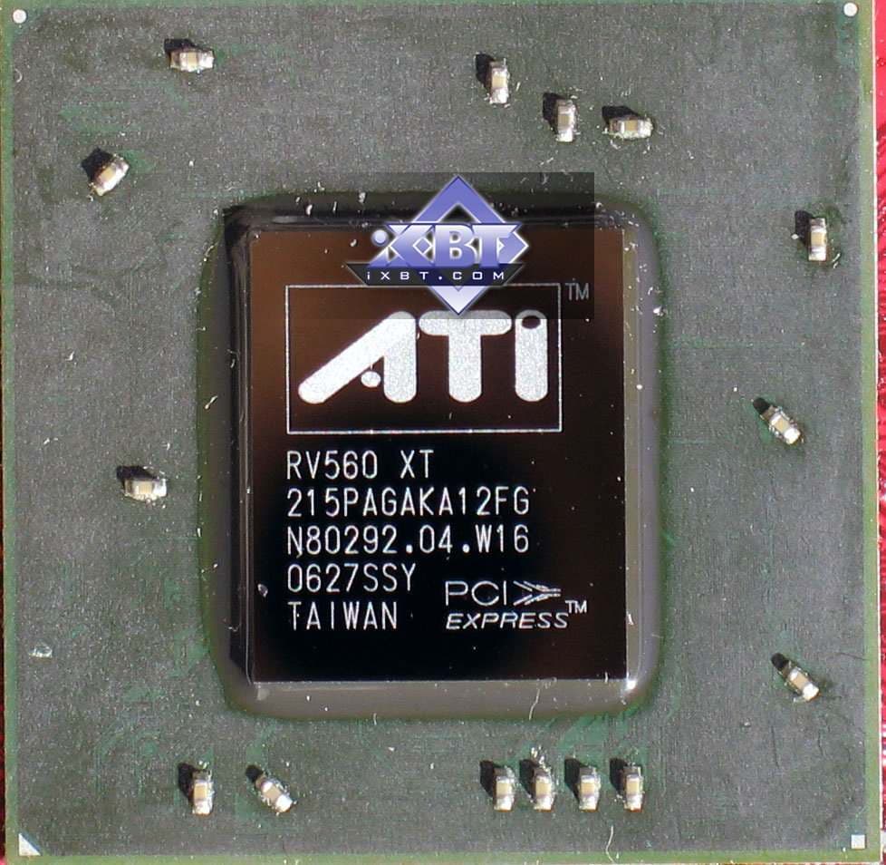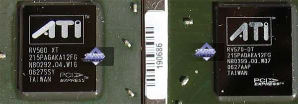 Что это? Почему кристаллы, полученные по одному тех процессу, и имеющие совершенно разные характеристики, одинаковые? Конечно можно предположить, что разные кеши и т.п. привели к такому. Но в это мало верится. Полагаю, что физически RV560 и RV570 - это ОДИН И ТОТ ЖЕ ЧИП! Кристалл используется ОДИН И ТОТ ЖЕ! Просто после тестирований часть идет на упаковку в 128-битный корпус FC-PGA, а часть - в 256-битный корпус, оснащенный защитной рамкой. При этом в первом случае урезается 1/3 пиксельных блоков и т.д.
