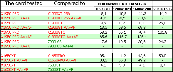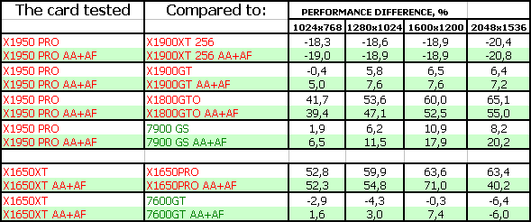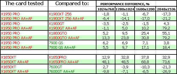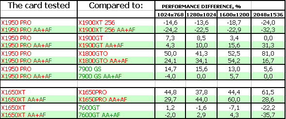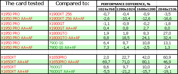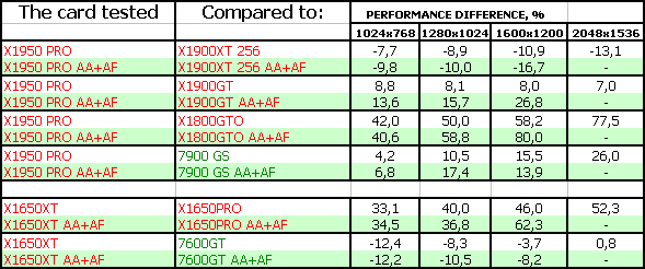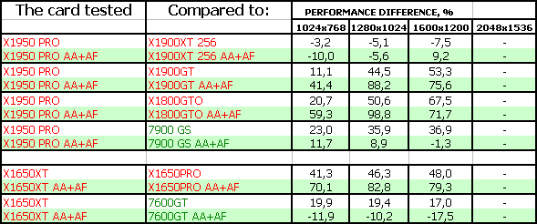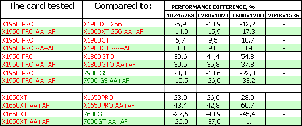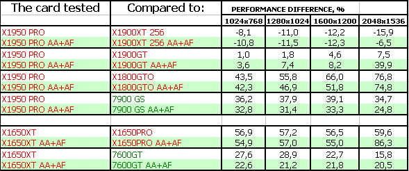 Прежде всего видно, что X1950 PRO победил конкурента в лице 7900GS, а также любопытно, что с ростом разрешения в режиме АА+АФ увеличивается преимущество над X1900GT, которое можно объяснить только лишь разными ПСП.