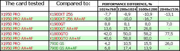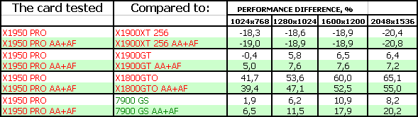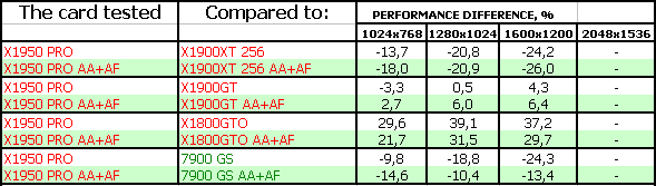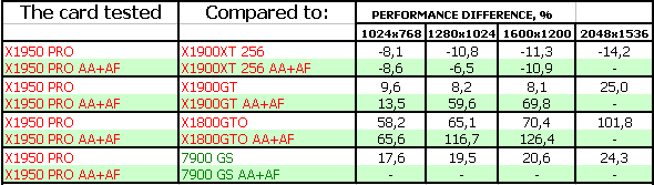 Прежде всего, видно, что X1950 PRO победил конкурента в лице 7900GS, а также любопытно, что с ростом разрешения в режиме АА+АФ увеличивается преимущество над X1900GT, которое можно объяснить лишь разными ПСП.