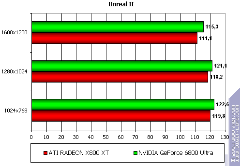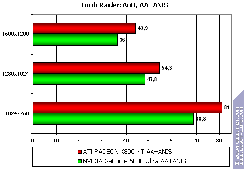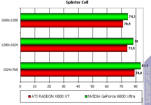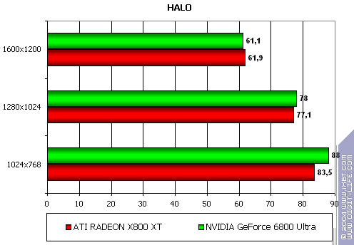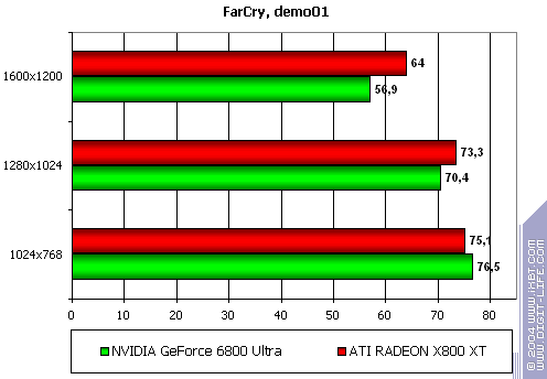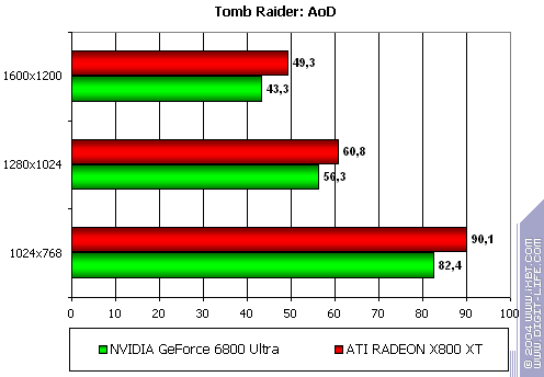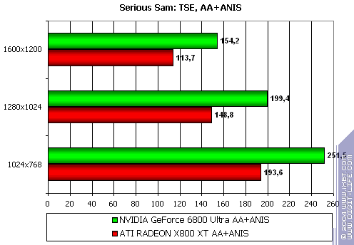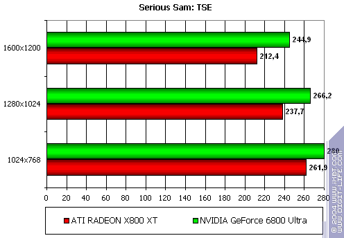- Gigabyte RADEON X800 XT PE против NVIDIA GeForce 6800 Ultra — уверенная победа, причем, как и в случае с Serious Sam: TSE, только лишь роли поменялись местами: у X800 XT при сильной нагрузке, лишь растет перевес над соперником.