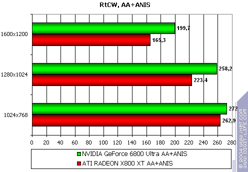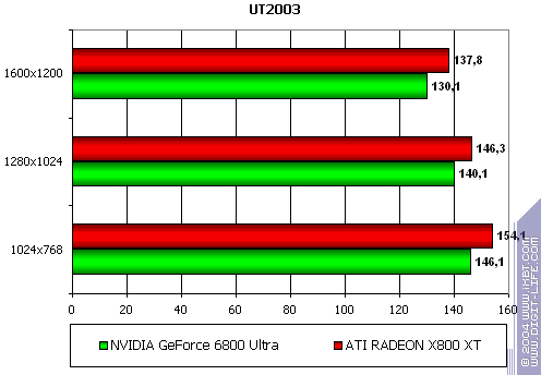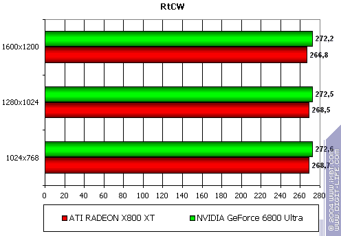 - Gigabyte RADEON X800 XT PE против NVIDIA GeForce 6800 Ultra — примерное равенство с легким преимуществом у X800 XT, учитывая, что при АА и АФ разрешения выше 1024х768 уже почти не играбельны.