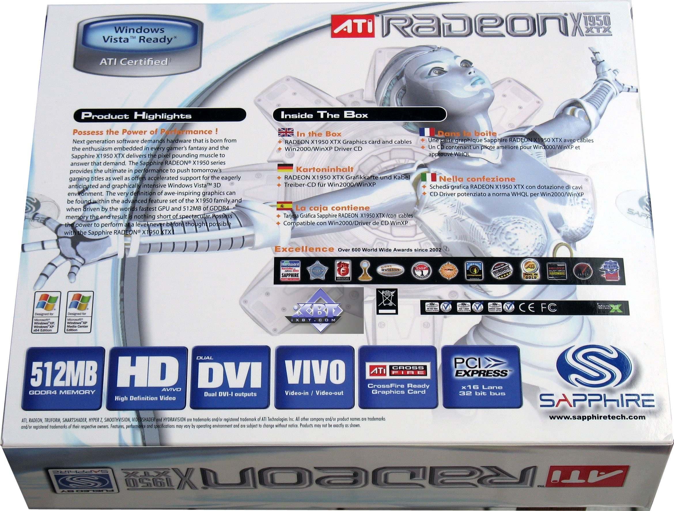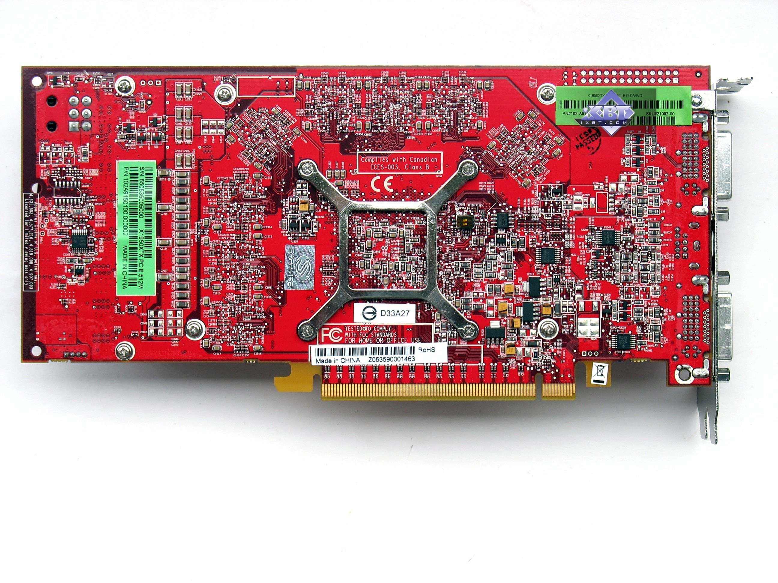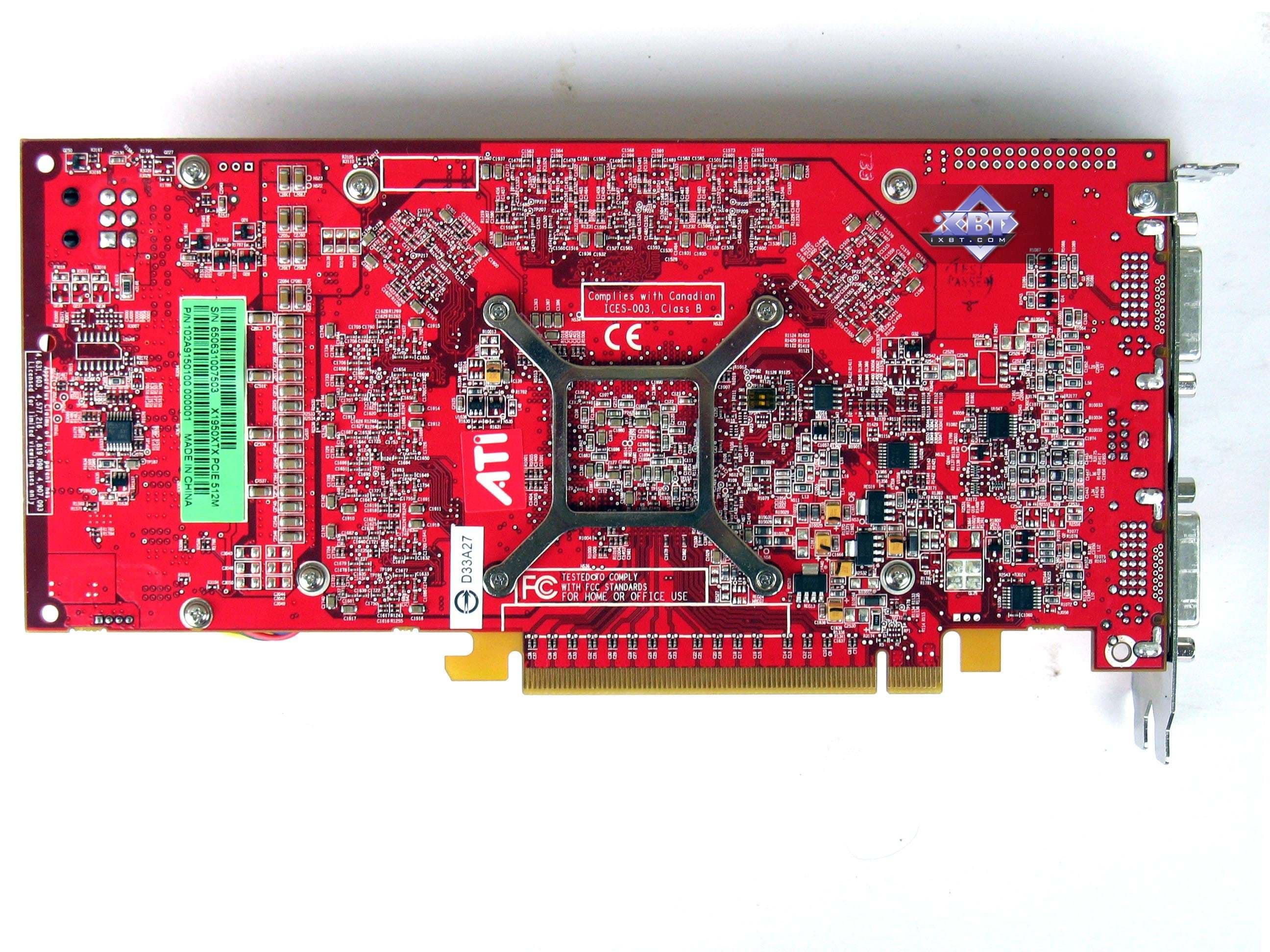 Что касается X1950 XTX, то это копия референс. Я еще раз напомню, что все продукты Hi-End уровня не производятся партнерами ATI самостоятельно, они покупают у ATI уже готовые карты, изготовленные на сторонней фабрике. Поэтому все X1900-1950-карты ОДИНАКОВЫЕ (имеется в виду внутри каждого вида, то есть X1950 XTX, купленный у ASUS, будет абсолютно таким же, что и у MSI или Gigabyte или Sapphire). То же самое касается и X1900XT, X1900XTX. Да и X1900GT пока никто сам не выпускает, поскольку он на той же PCB.