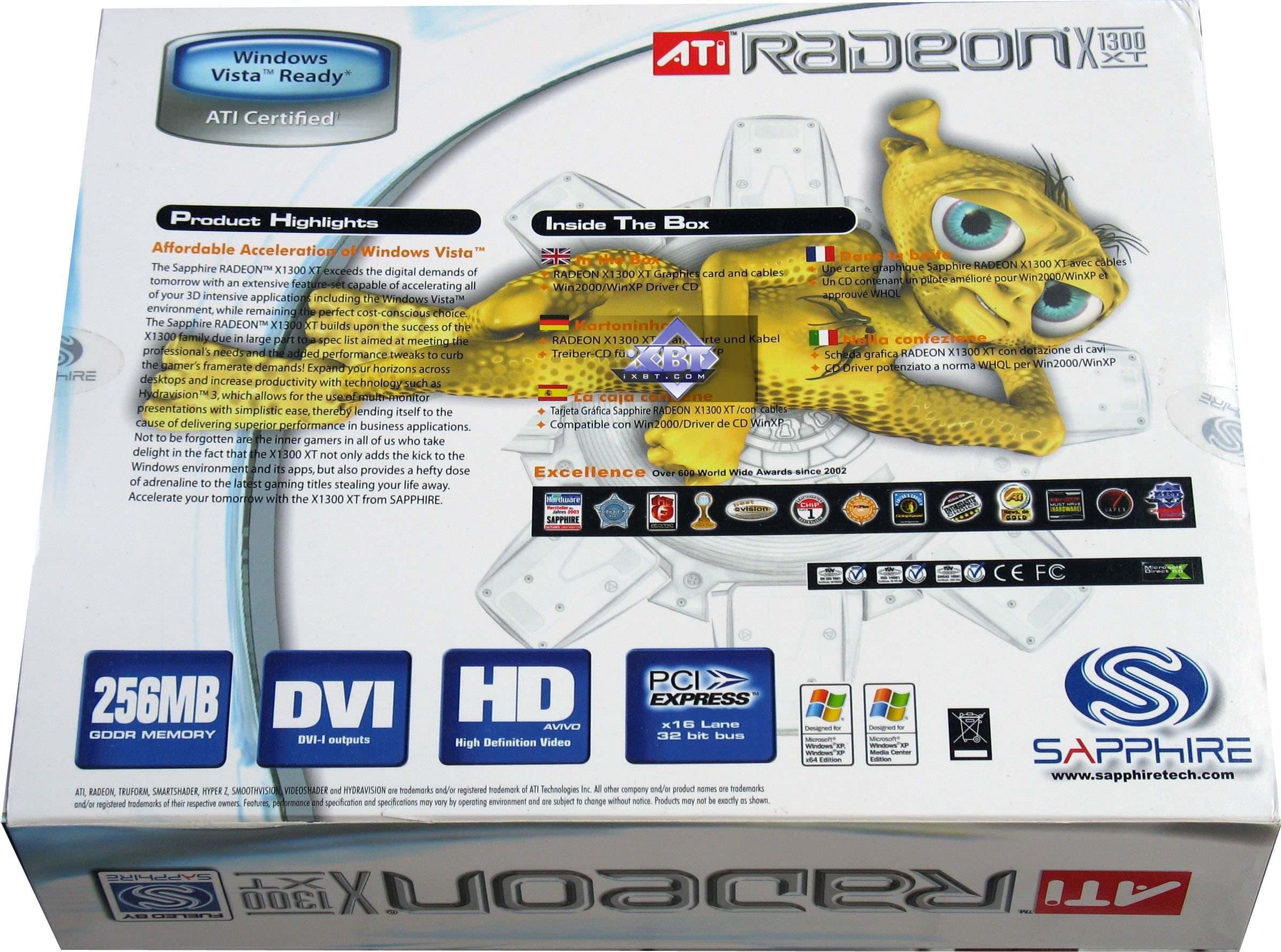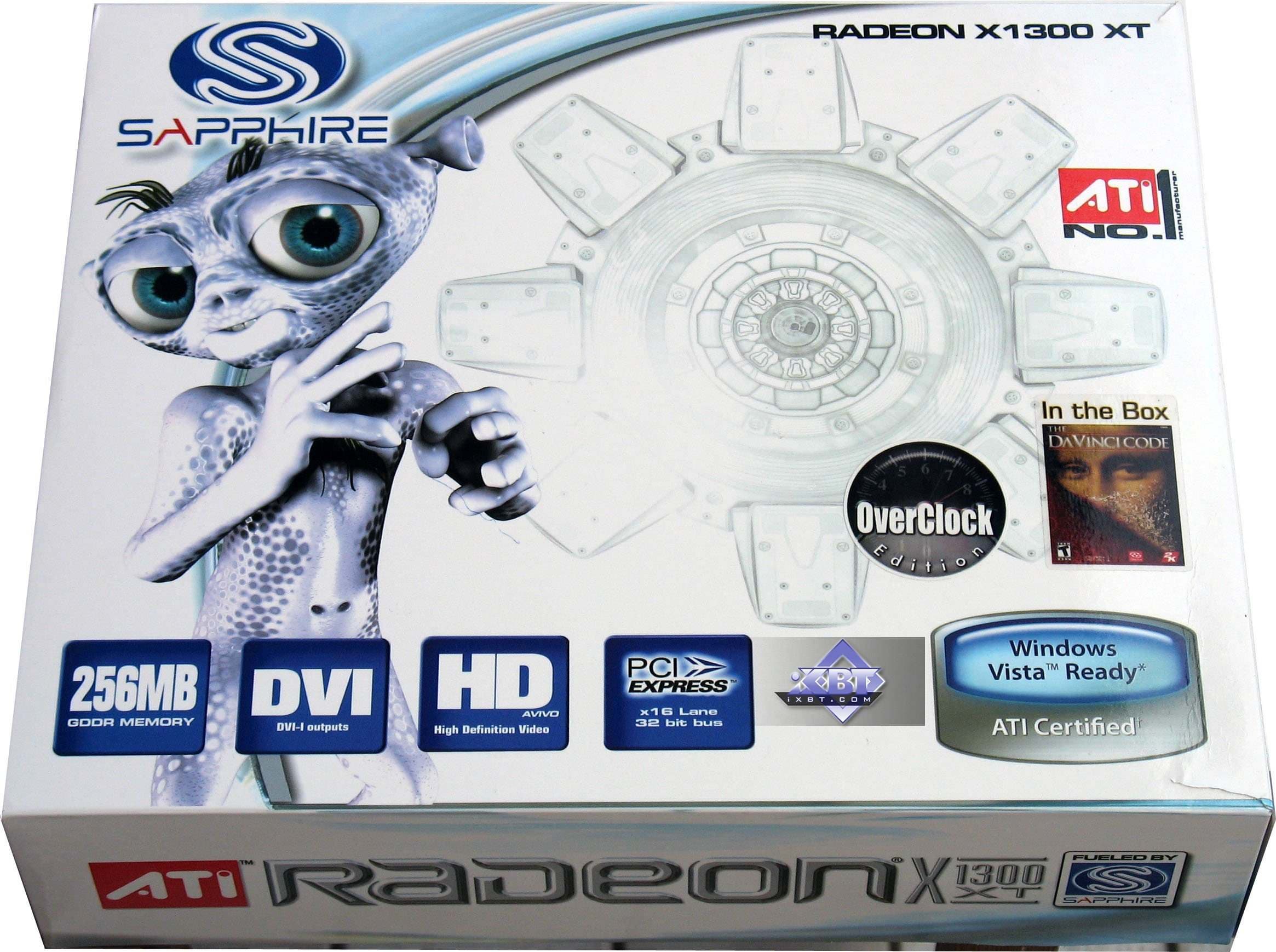 - Sapphire RADEON X1300 XT Overclocked Edition 256MB PCI-E — продукт для ценовой ниши ниже 80 долларов США, и там эта карта показывает себя весьма неплохо. И даже очень хороша для такой цены. Правда, надо учитывать, что это разогнанный вариант. Качество у изделия очень высокое, и даже в 2D в 1600х1200 при 85Гц нареканий не было (повторяю, что речь идет об аналоговом выводе, и оценка дается только для данного экземпляра совместно с данным монитором).