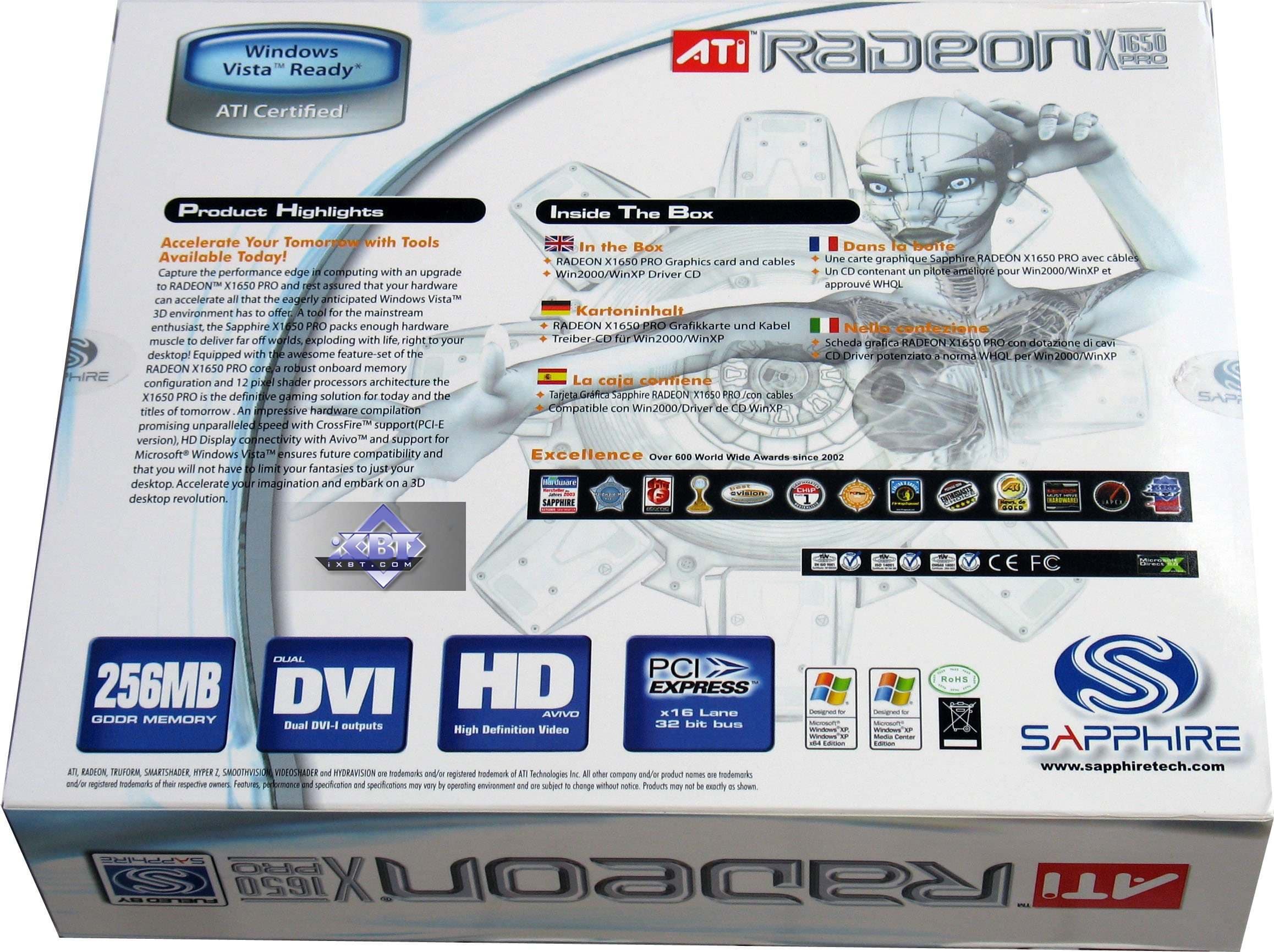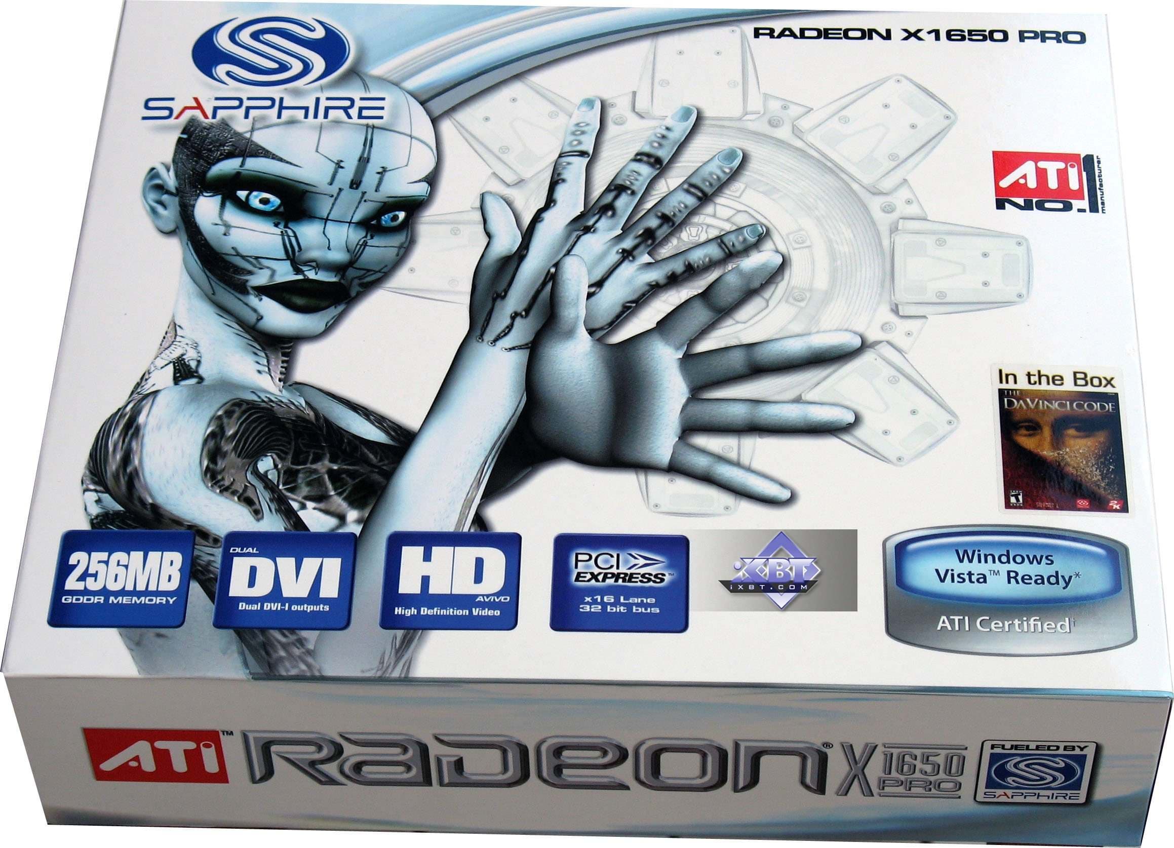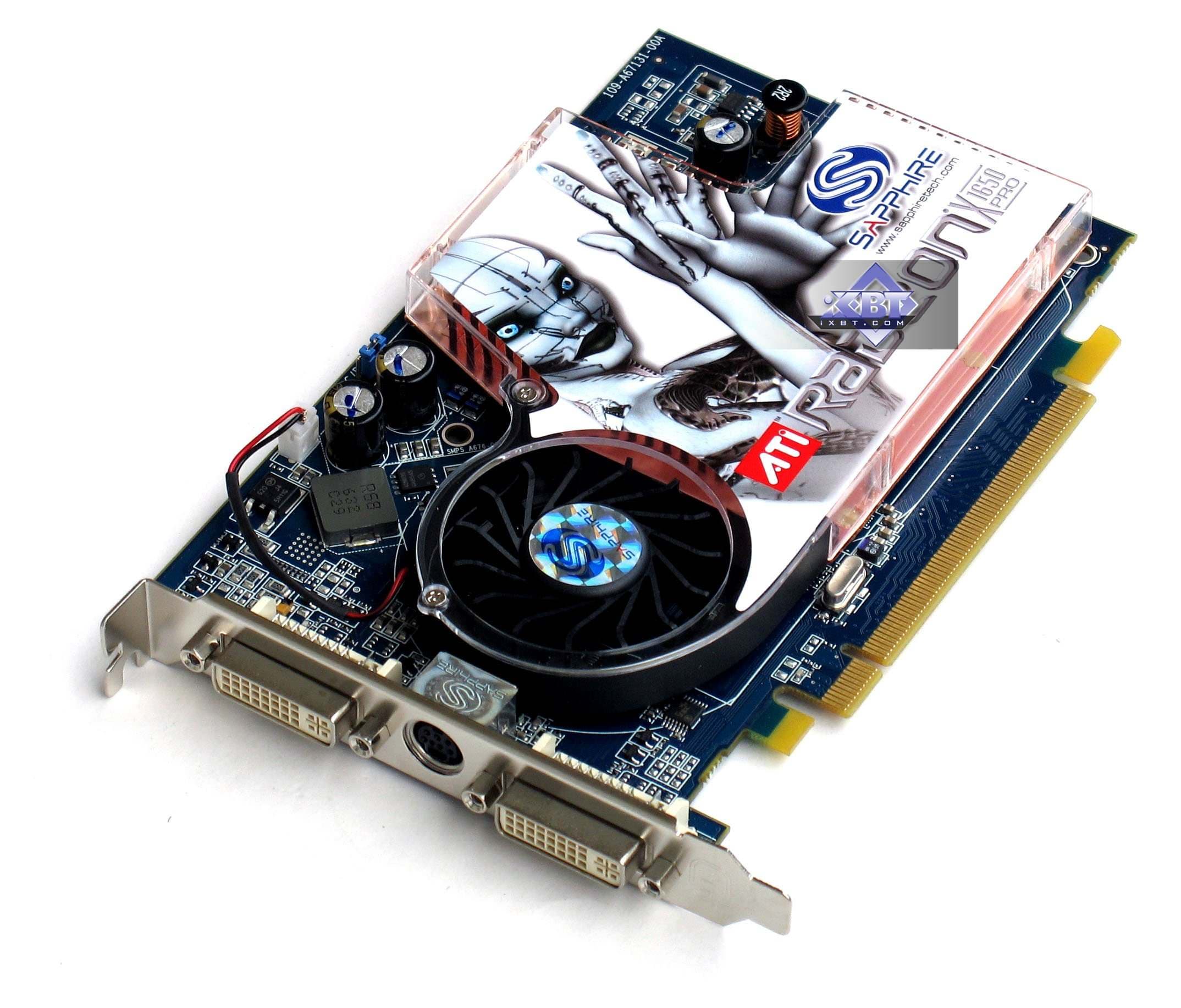 - Sapphire RADEON X1650 PRO 256MB PCI-E — очень хороший выбор для тех, кто прикупить ускоритель по цене около 100 долларов США. По сути, перед нами X1600 XT за такую цену. Экземпляр отработал отлично, нареканий нет, качество 2D в 1600х1200 замечательно. Однако возникает вопрос. Если предыдущий показывает примерно такую же скорость, то зачем платить больше? Мне крайне непонятны мотивы Sapphire, выпустившей, по сути, один и тот же акселератор, но назвав их по-разному и по разным ценам. Возможно, что X1300 XT OE будет в очень ограниченном количестве, иначе все побегут покупать именно его, а не X1650 PRO. Хотя производитель, скорее всего, будет продавать эти две карты по равной цене.