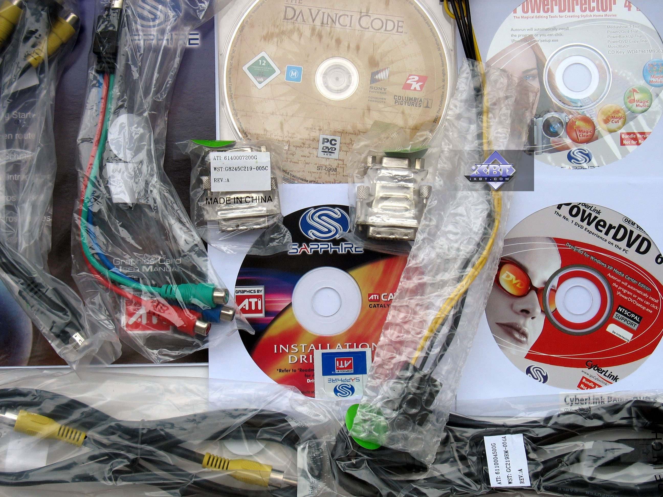 У карт имеются гнезда TV-выхода, которые уникальны по разъему, и для вывода изображения на ТВ как через S-Video, так и по RCA, требуются специальные адаптеры-переходники, поставляемые вместе с картами. Более подробно о ТВ-выходе можно почитать здесь. А также X1950 XTX оснащен TV-in, подключение осуществляется также через специальный переходник.