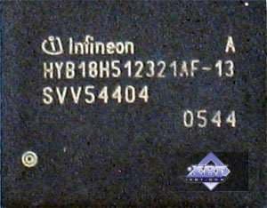 | Карта имеет 256 МБ памяти GDDR3 SDRAM, размещенной в 4-х микросхемах на лицевой стороне PCB. Микросхемы памяти Infineon (GDDR3). Время выборки у микросхем памяти 1.3 ns, что соответствует частоте работы 750 (1500) МГц. | ![]() |
