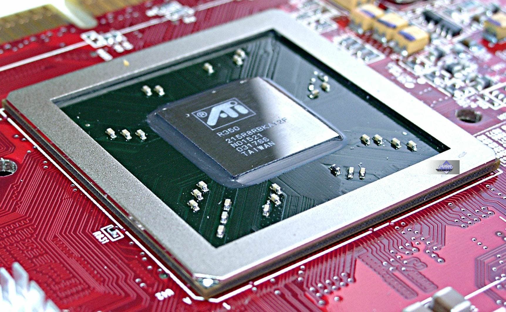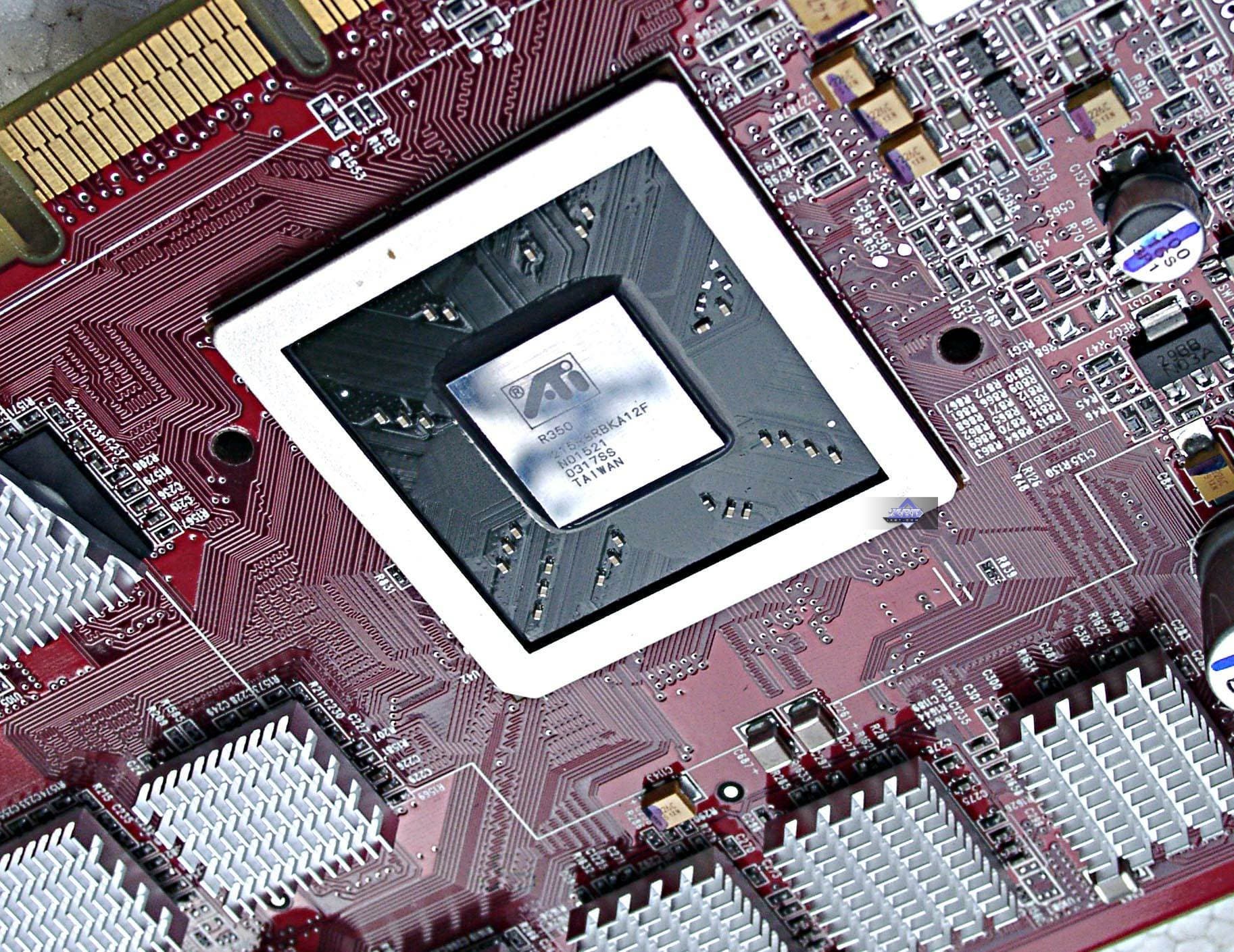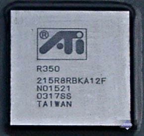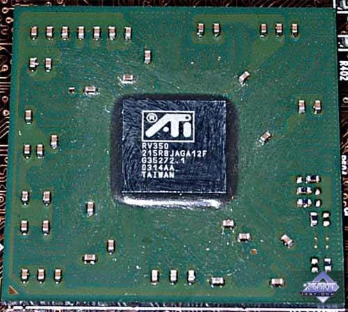А это RV350. Упаковка та же FCPGA, но размеры чипа очень малы. Интересно отметить, что у RADEON 9600 радиатор приклеен прямо на это махонький кристалл: