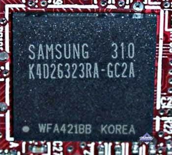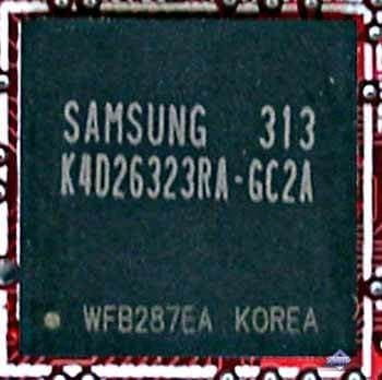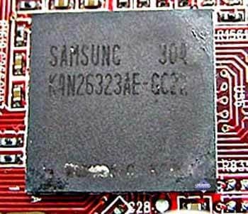 | Карта имеет интерфейс AGP x8/x4/x2, 256 МБ памяти GDDR2 SDRAM, размещенной в 16-ти микросхемах на лицевой и оборотной сторонах PCB. На карте установлены микросхемы памяти Samsung марки K4N26323AE-GC22, форм-фактора BGA. Максимальная частота работы — 450 (900) МГц, время выборки — 2.2 нс. По умолчанию память работает на частоте 350 (700) МГц, чип — 380 МГц. Мы видим, что несмотря на столько внушительный потенциал работы памяти, частота сильно занижена. Да, перегрев по памяти дает знать не только на NV30, но и здесь. Вероятно, чтобы не ставить очень внушительную систему охлаждения, да и не усложнять разводку PCB, разработчики ограничились частотой в 350 МГц (смысл? Когда обычная DDR 2.8ns память способна работать на такой же частоте по штату!). | ![]() |