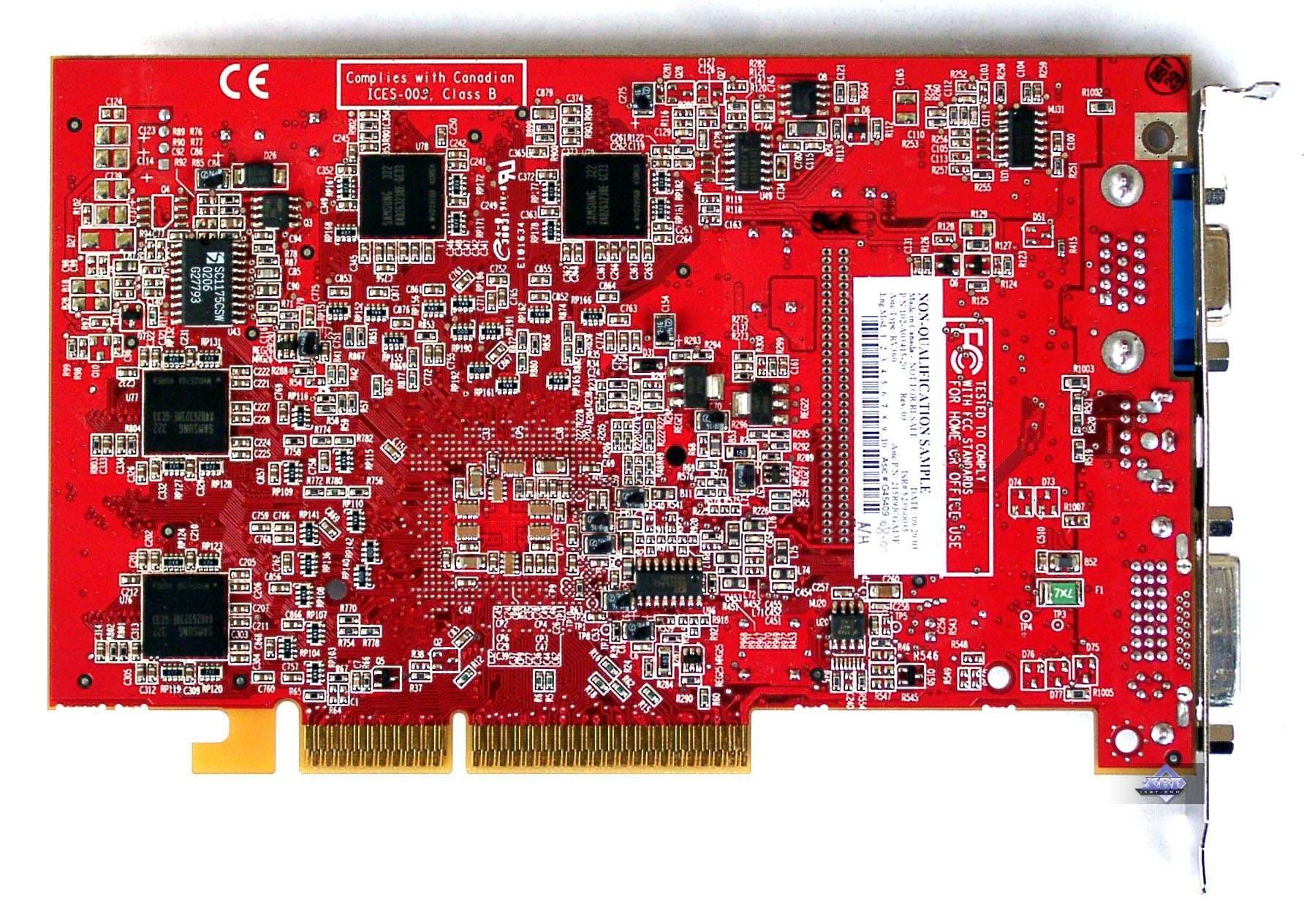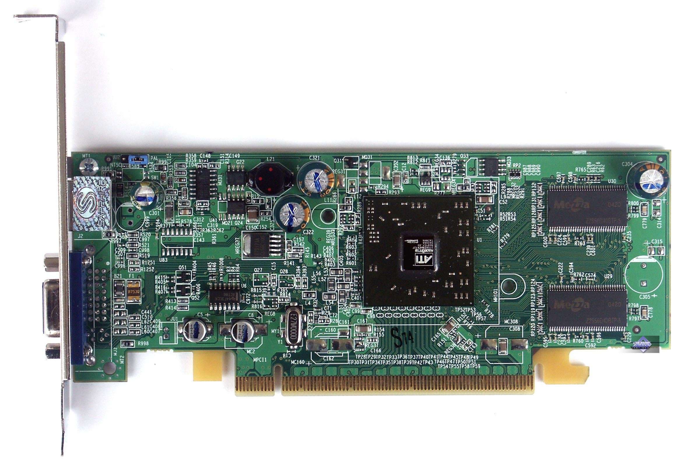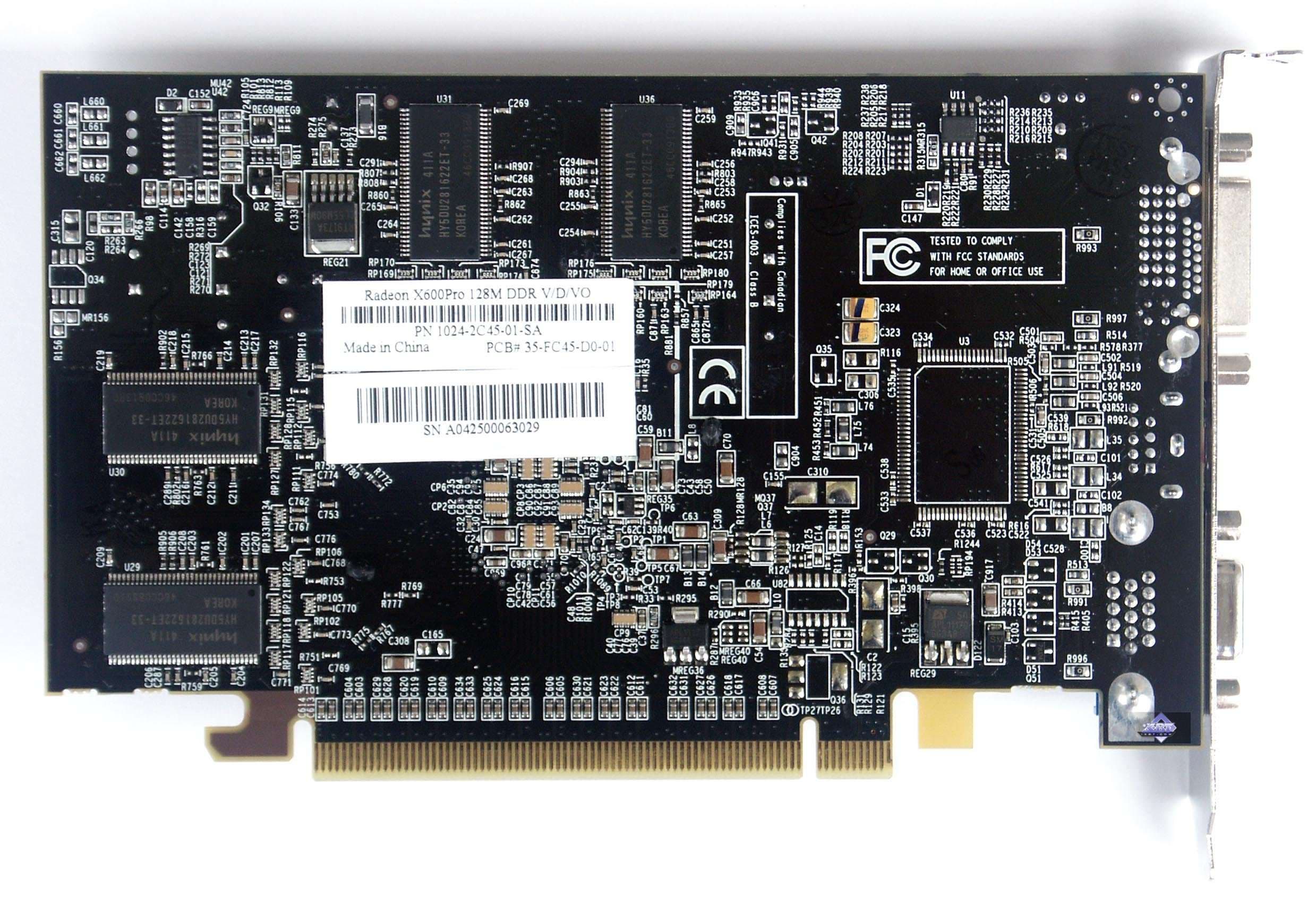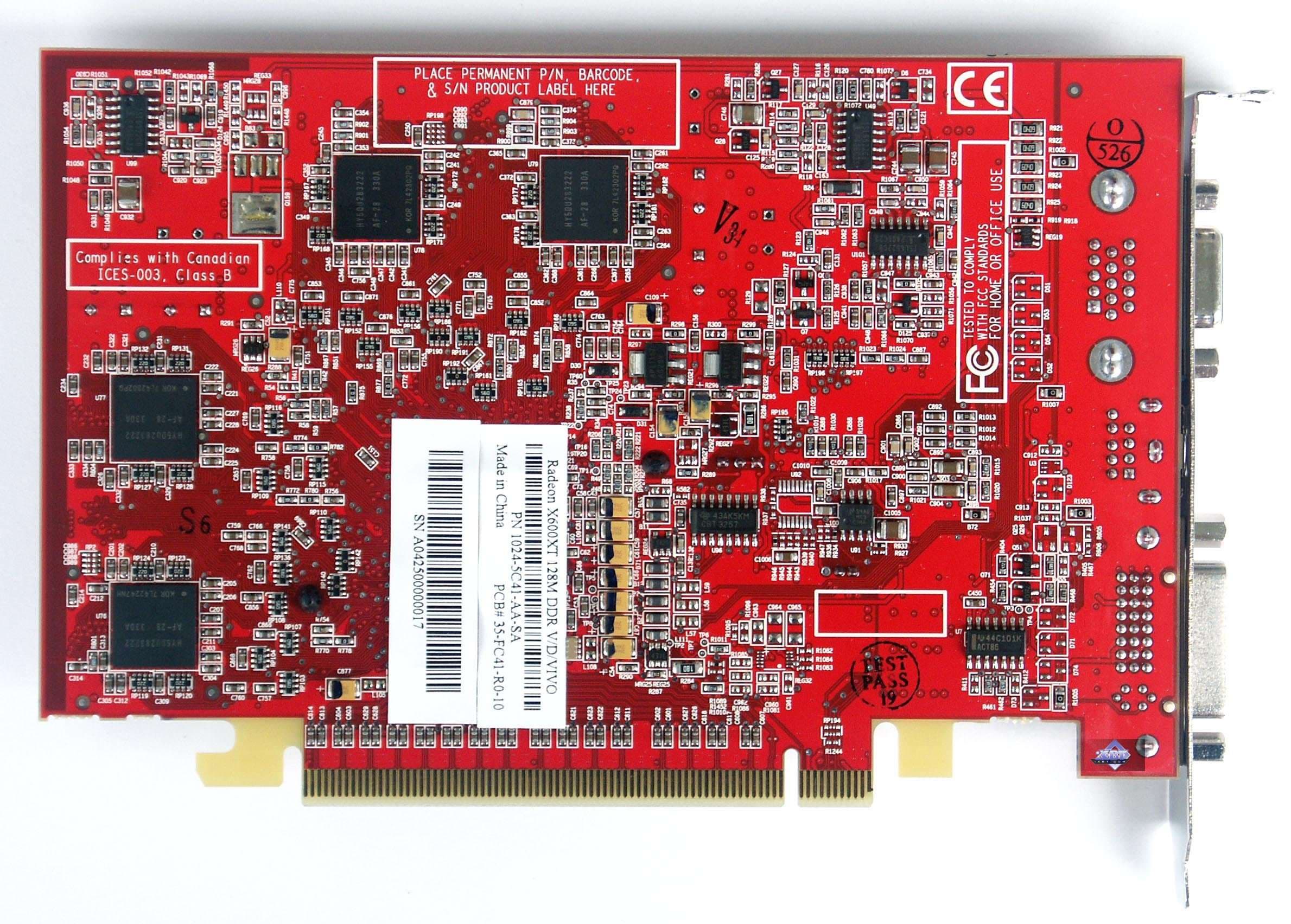 | Карта имеет интерфейс PCI-Express x16, 128 МБ памяти DDR SDRAM, размещенной в 8-ми микросхемах на лицевой и оборотной сторонах PCB. Микросхемы памяти Hynix. Время выборки у микросхем памяти 2,8 ns, что соответствует частоте работы 350 (700) МГц, память же работает на частоте 340 (680) МГц (Прошу обратить внимание, что память работает на частотах ниже, чем у обычного X600XT — 380 (760) MHz). Частота работы GPU — 500 MHz Шина обмена с памятью — 128 bit. Число пиксельных конвейеров × число текстурных блоков — 4х1. | ![]() |