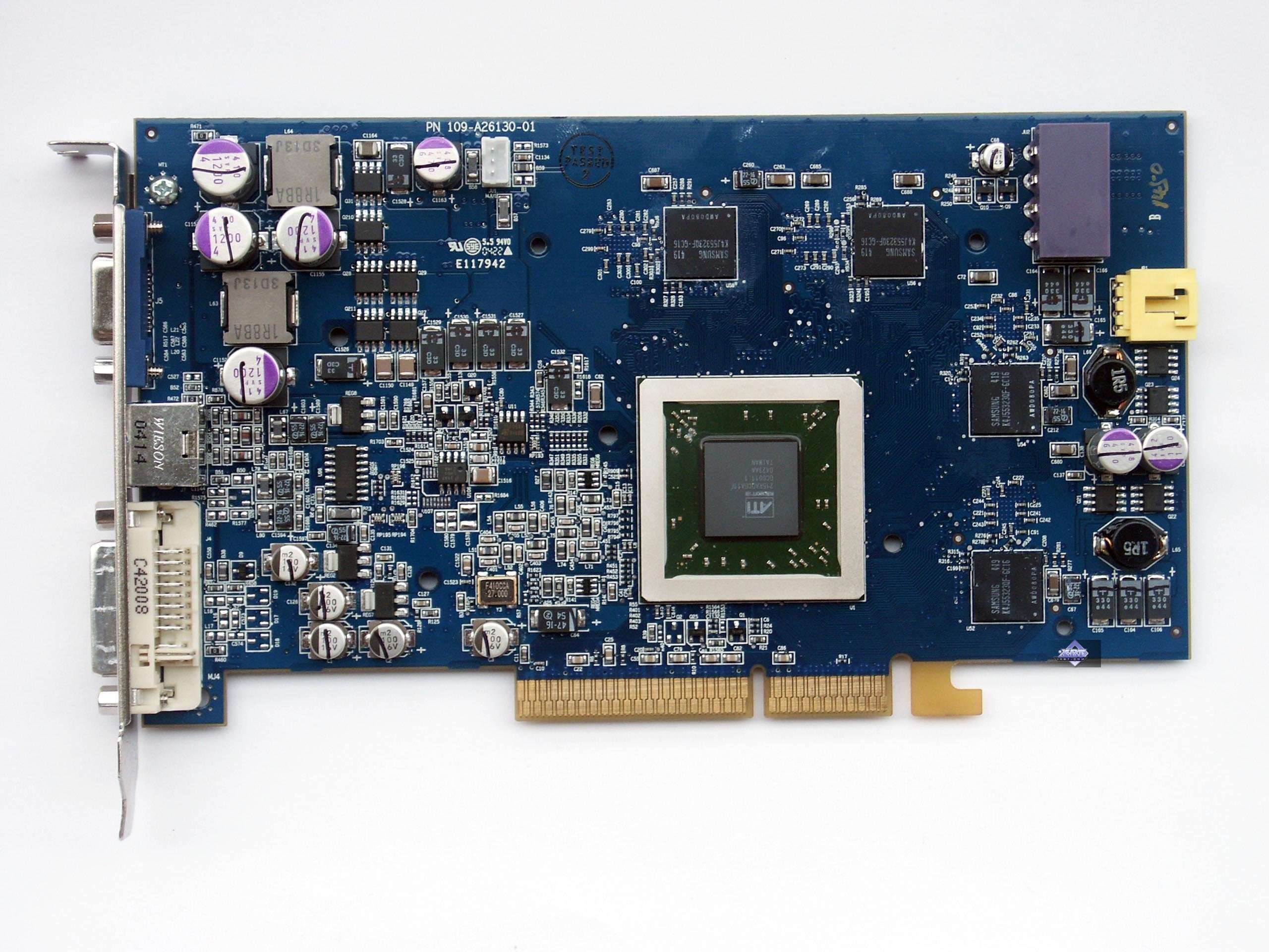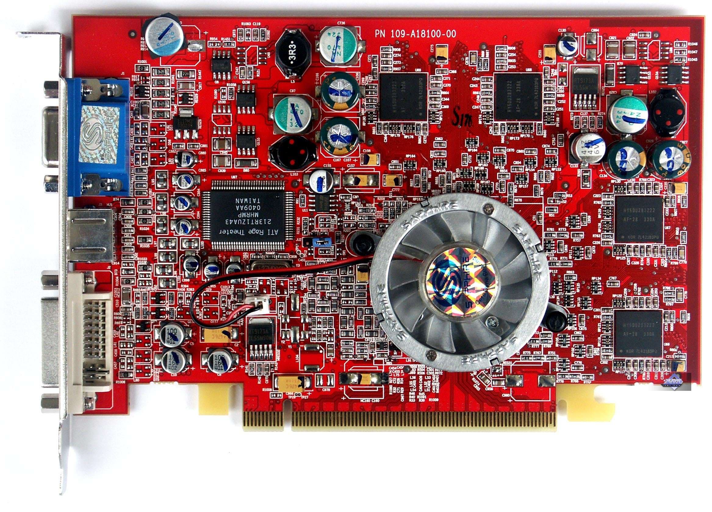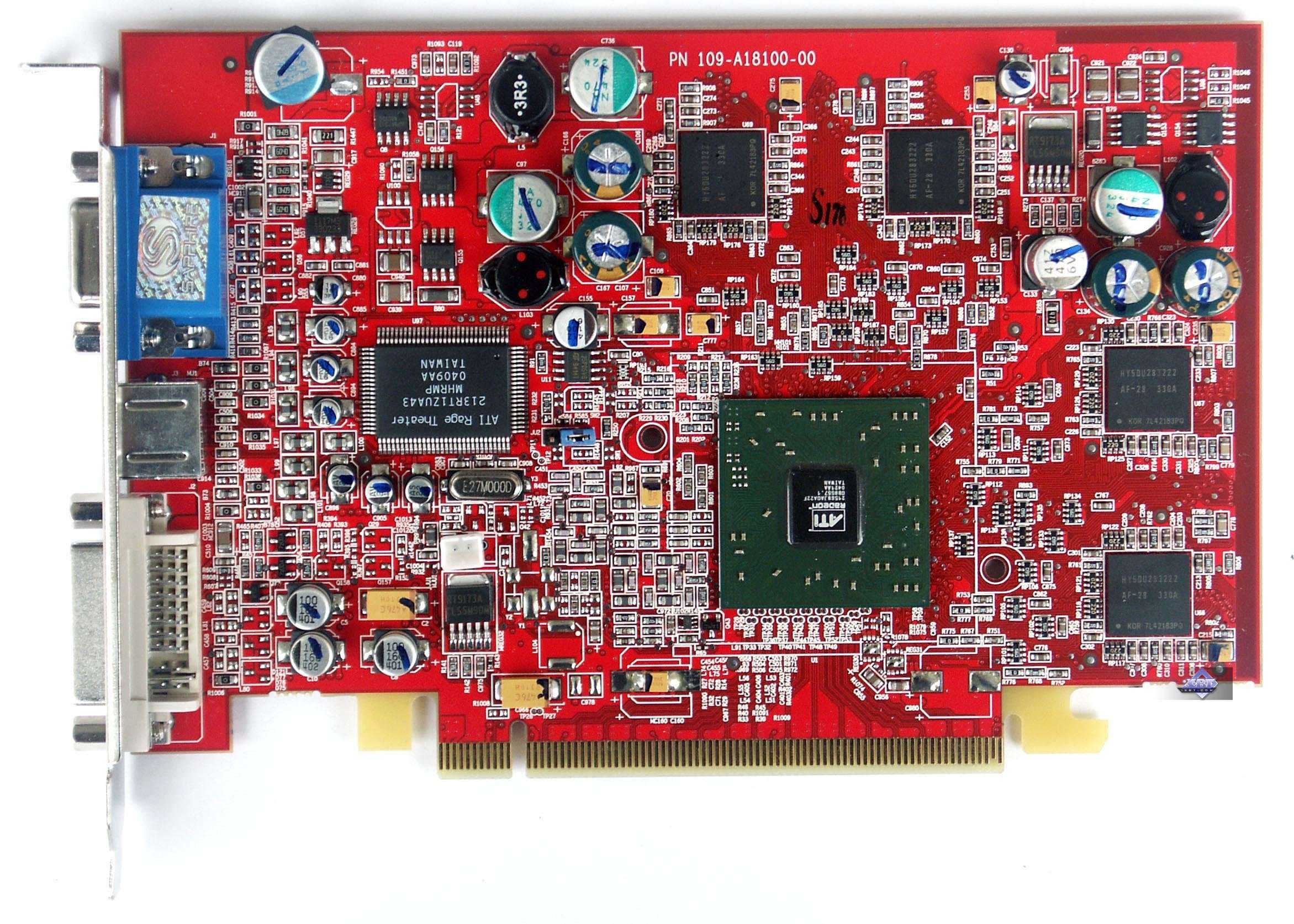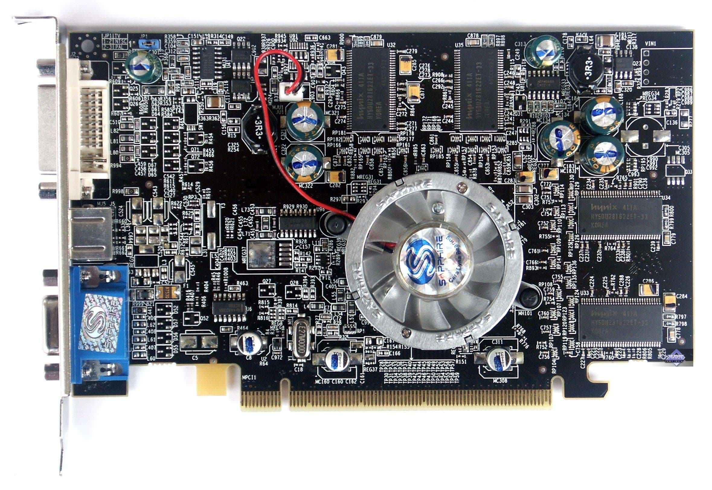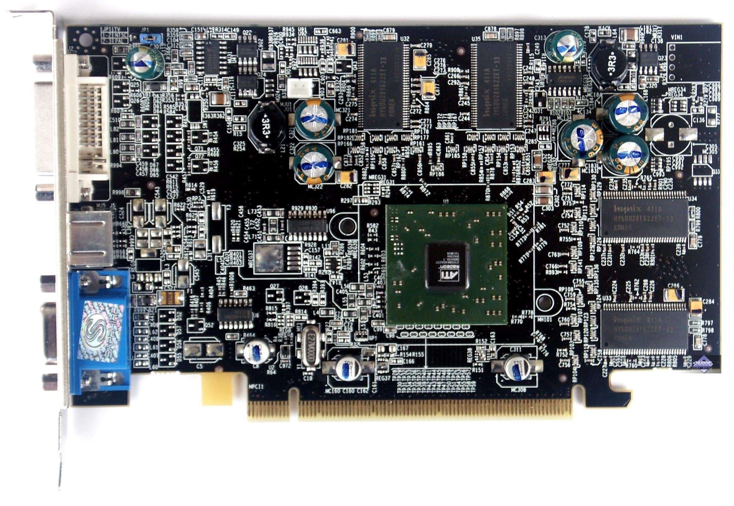 | Карта имеет интерфейс PCI-Express x16, 128 МБ памяти DDR SDRAM, размещенной в 8-ми микросхемах на лицевой и оборотной сторонах PCB. Микросхемы памяти Hynix. Время выборки у микросхем памяти 2,8 ns, что соответствует частоте работы 350 (700) МГц, память же работает на частоте 340 (680) МГц (Прошу обратить внимание, что память работает на частотах ниже, чем у обычного X600XT — 380 (760) MHz). Частота работы GPU — 500 MHz Шина обмена с памятью — 128 bit. Число пиксельных конвейеров × число текстурных блоков — 4х1. | ![]() |