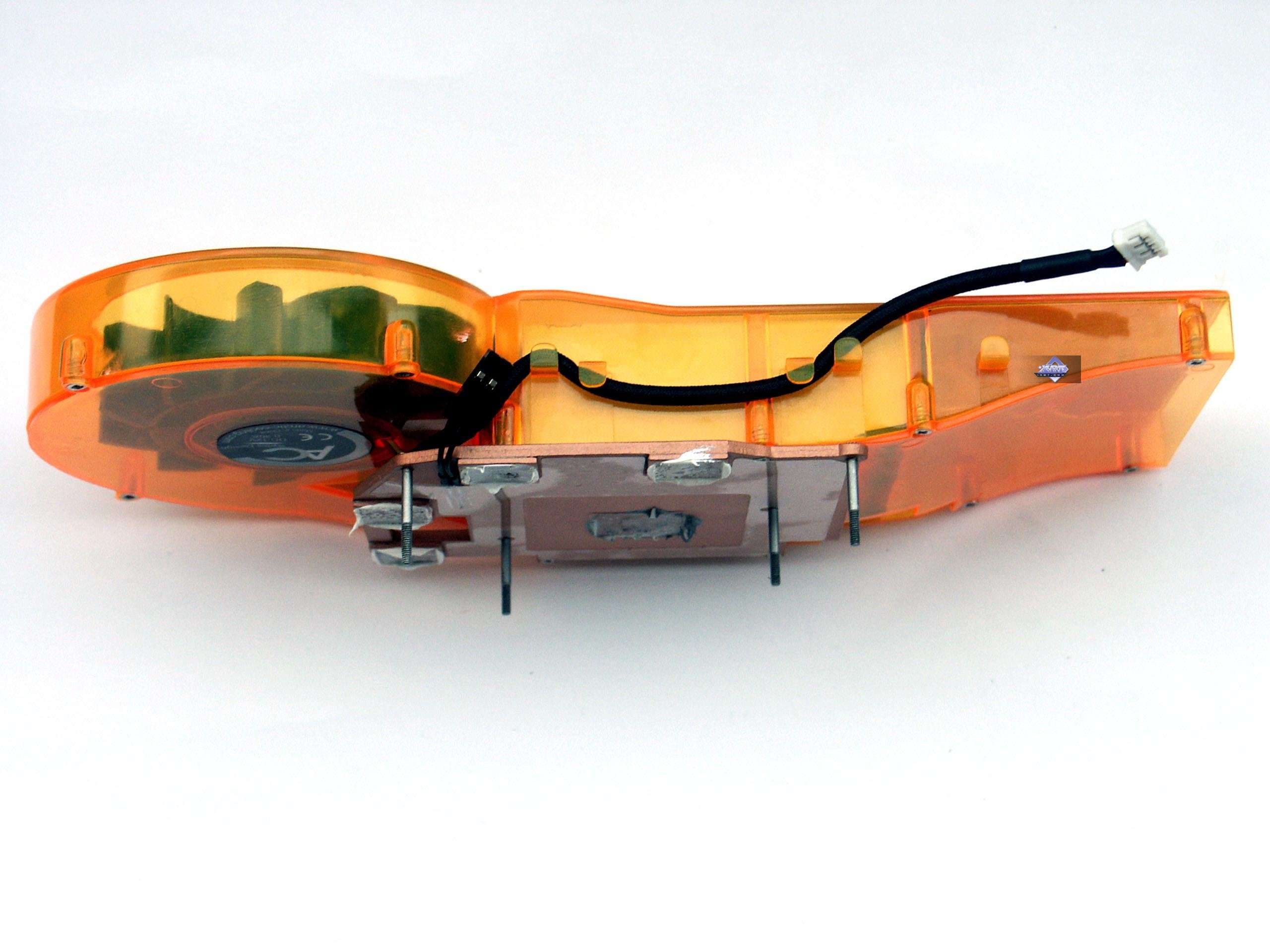 Надо сказать, что кроме расцветки PCB примечательным является окрас кулера. Причем, это не просто оранжевый цвет, а светящийся в ультрафиолете (на снимке справа).